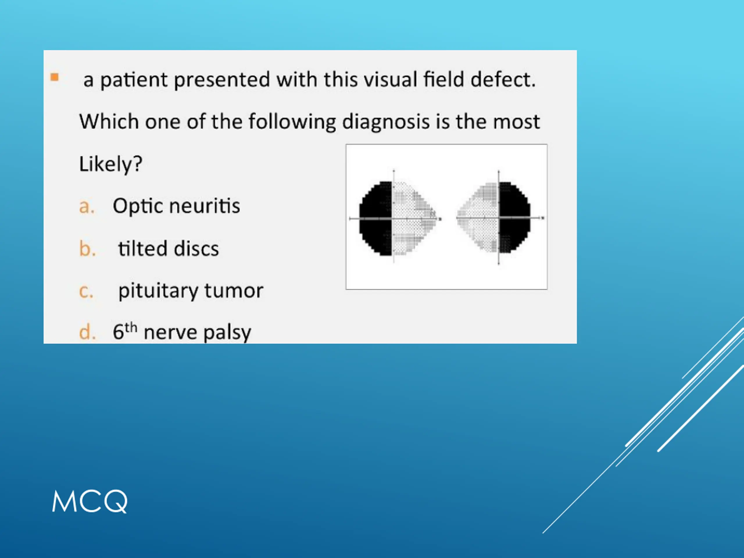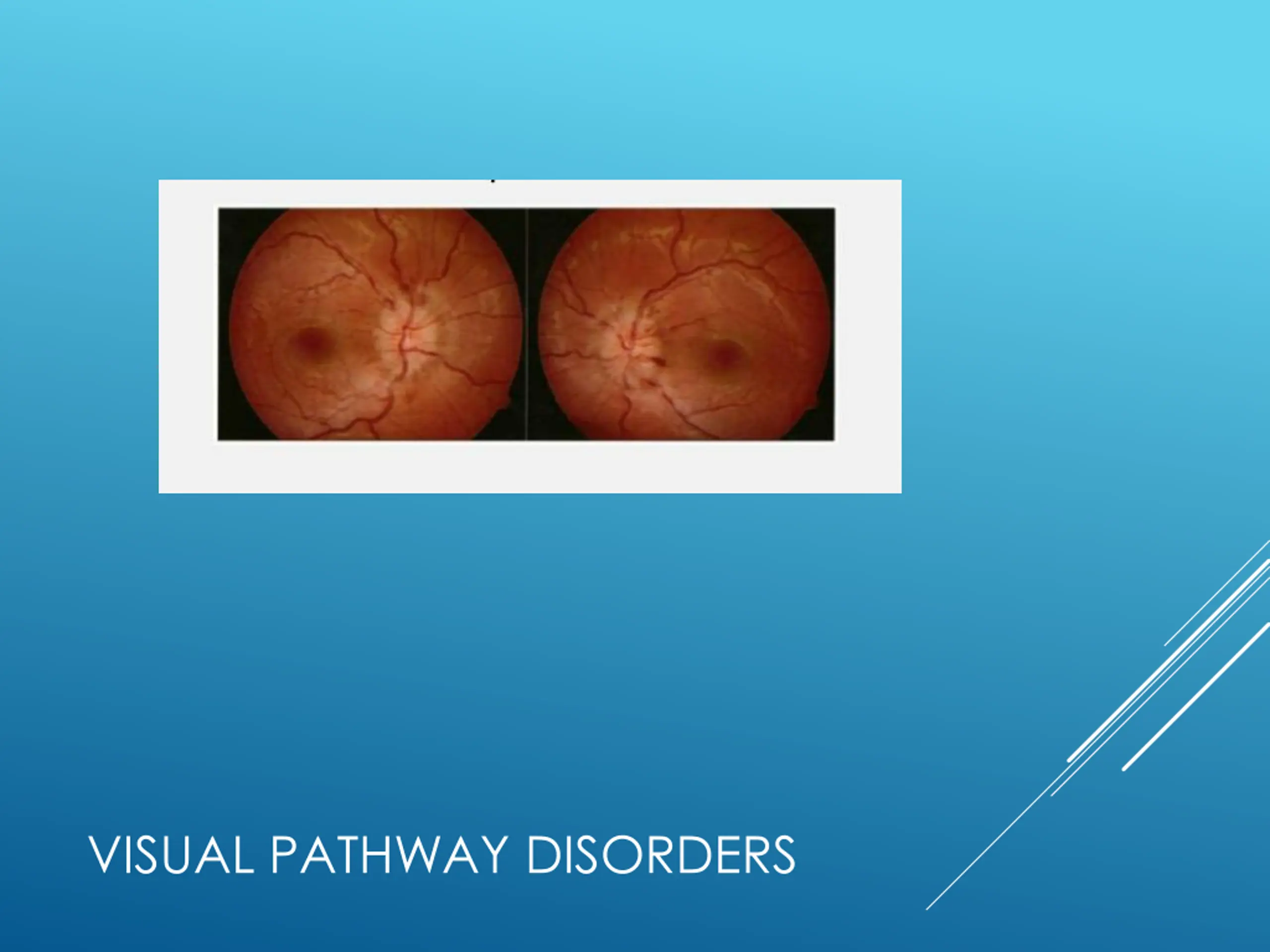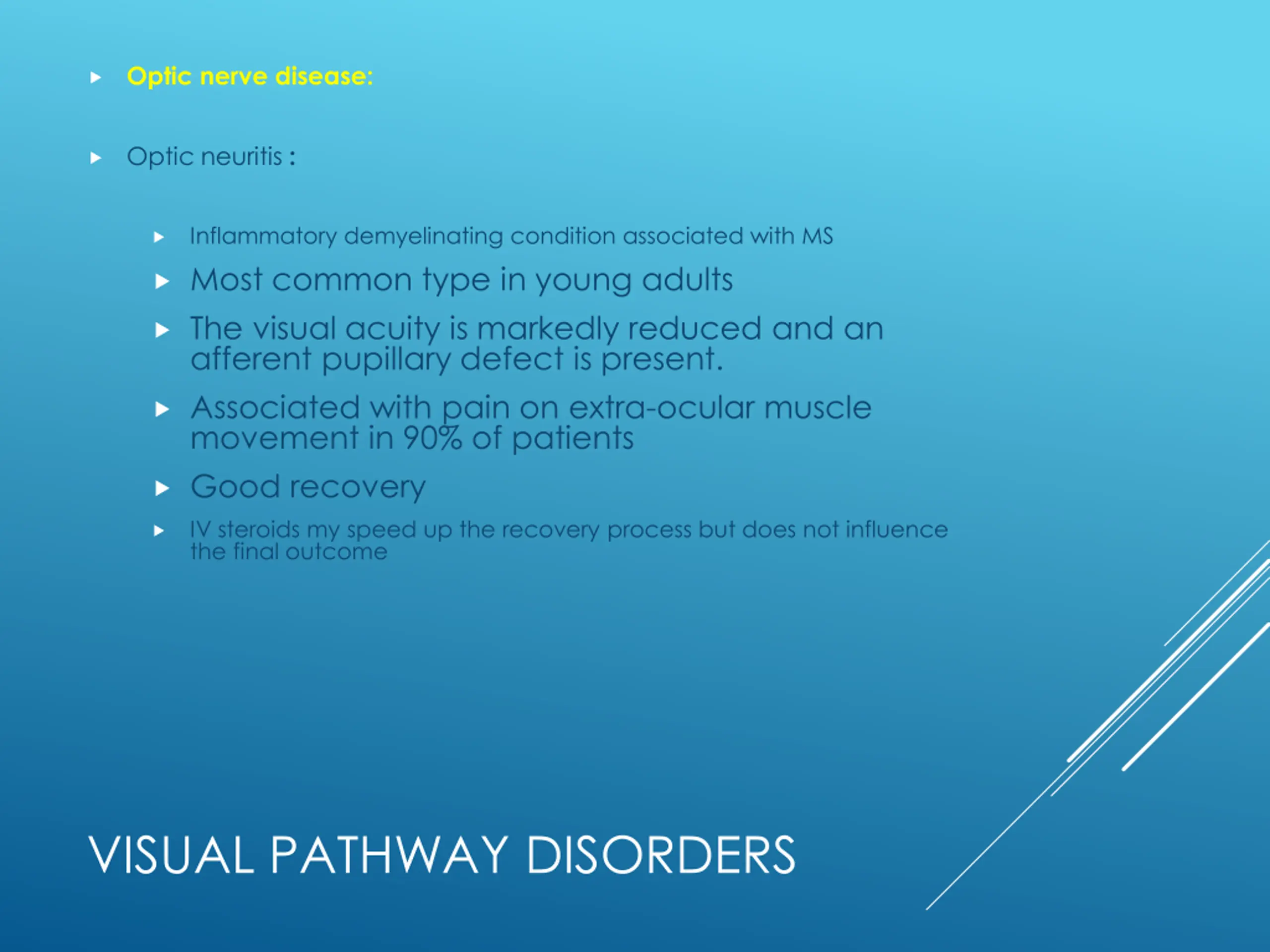 Optic nerve disease: Optic neuritis : Inflammatory demyelinating condition associated with MS Most common type in young adults The visual acuity is markedly reduced and an afferent pupillary defect is present. Associated with pain on extra-ocular muscle movement in 90% of patients Good recovery IV steroids my speed up the recovery process but does not influence the final outcome VISUAL PATHWAY DISORDERS
