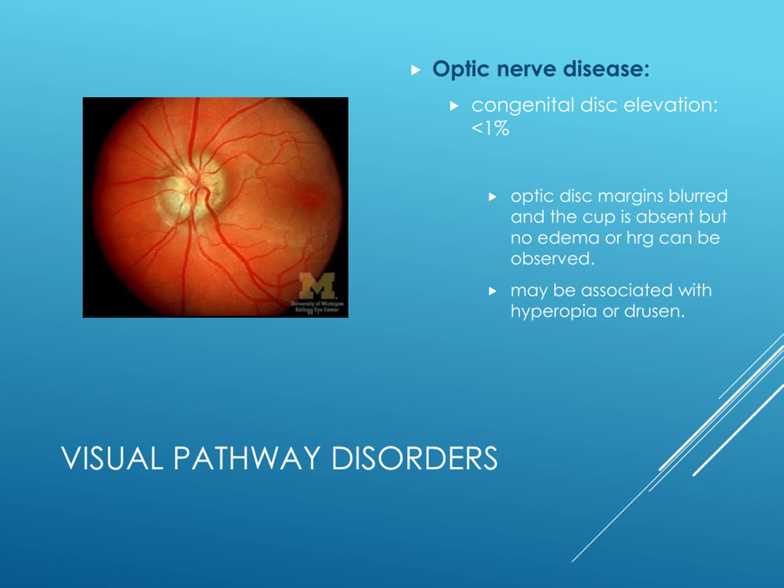 Optic nerve disease: congenital disc elevation: <1% optic disc margins blurred and the cup is absent but no edema or hrg can be observed. may be associated with hyperopia or drusen. VISUAL PATHWAY DISORDERS