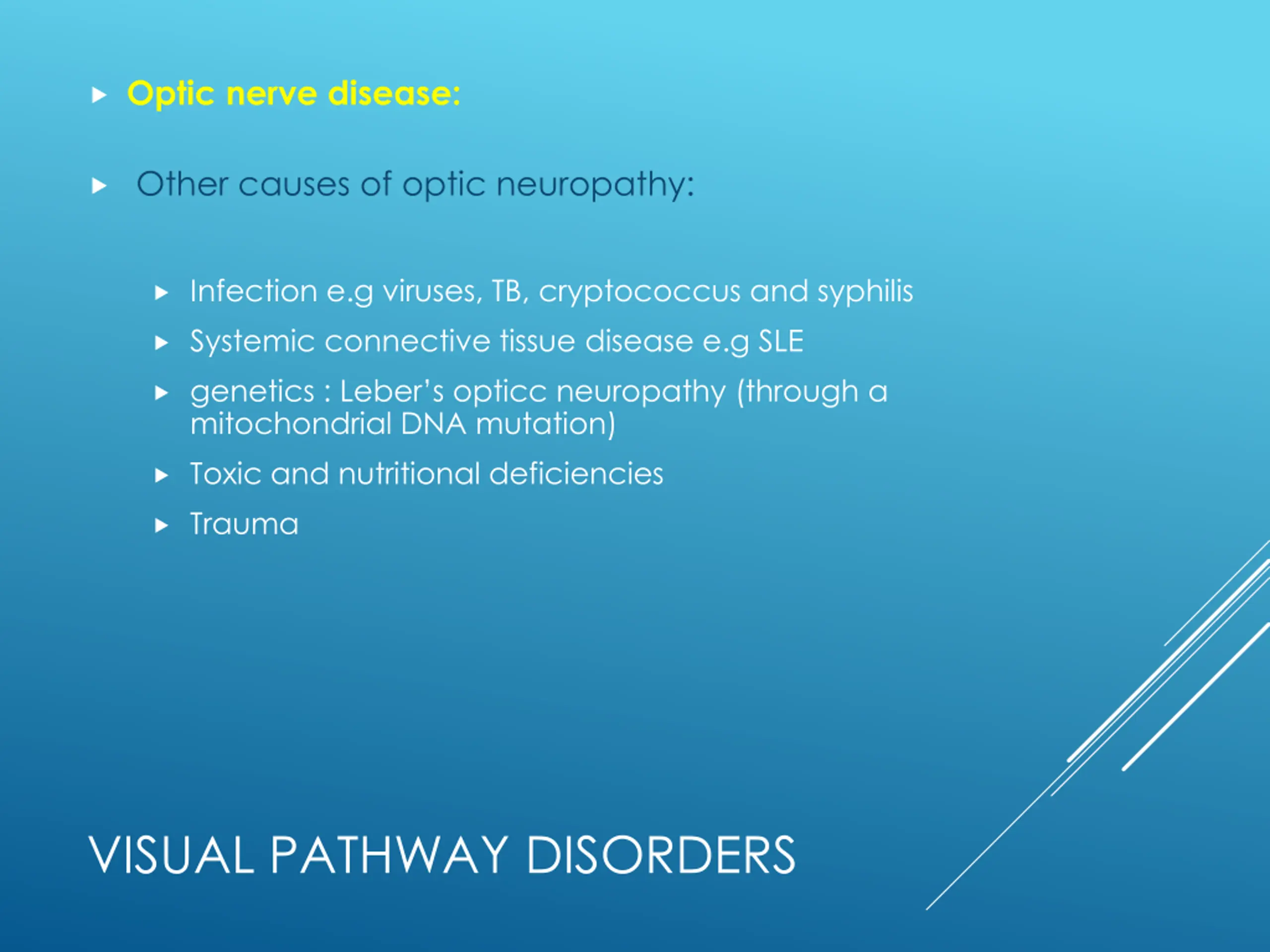 Optic nerve disease: Other causes of optic neuropathy: Infection e.g viruses, TB, cryptococcus and syphilis Systemic connective tissue disease e.g SLE genetics : Leber s opticc neuropathy (through a mitochondrial DNA mutation) Toxic and nutritional deficiencies Trauma VISUAL PATHWAY DISORDERS