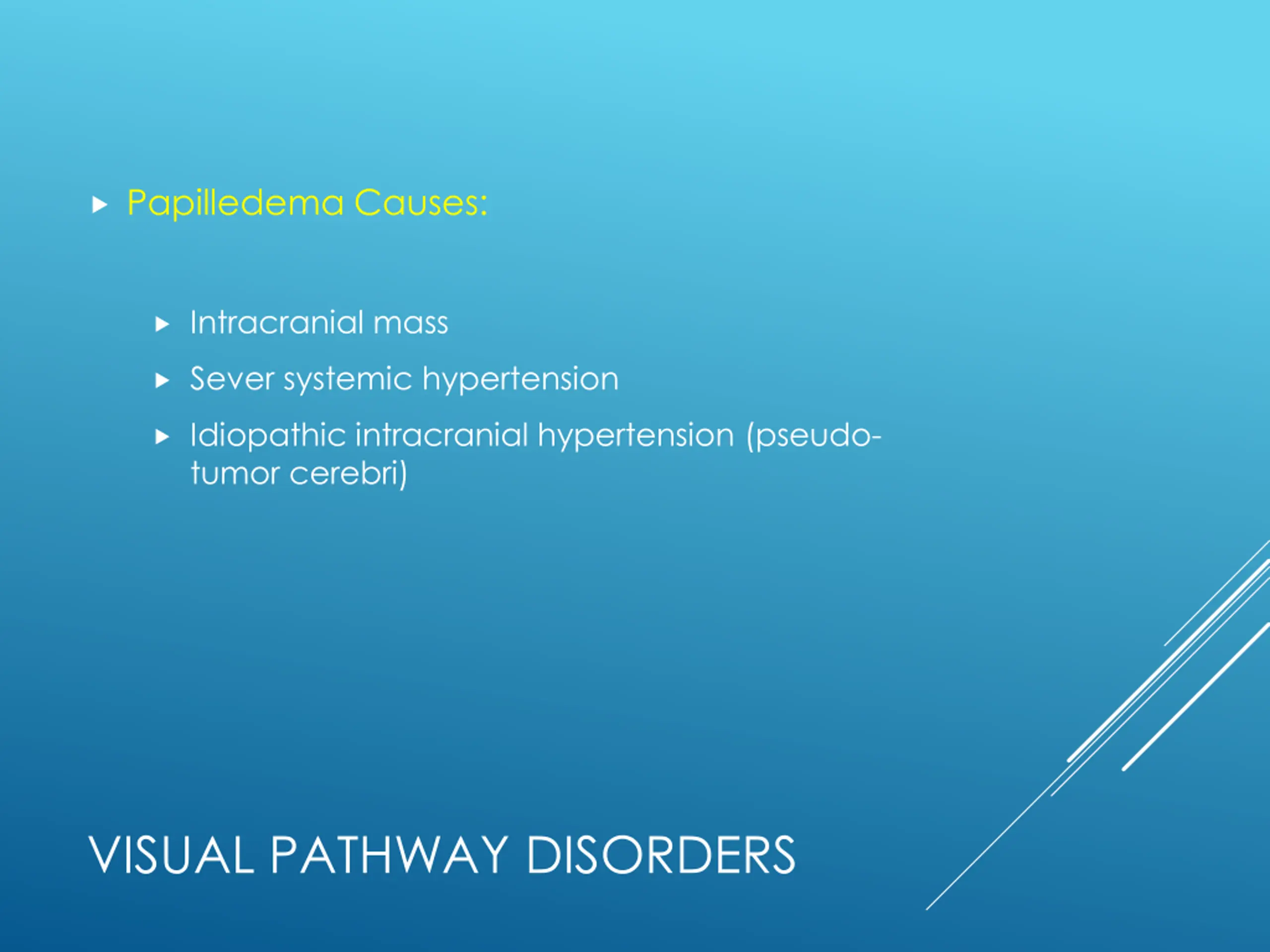 Papilledema Causes: Intracranial mass Sever systemic hypertension Idiopathic intracranial hypertension (pseudo- tumor cerebri) VISUAL PATHWAY DISORDERS
