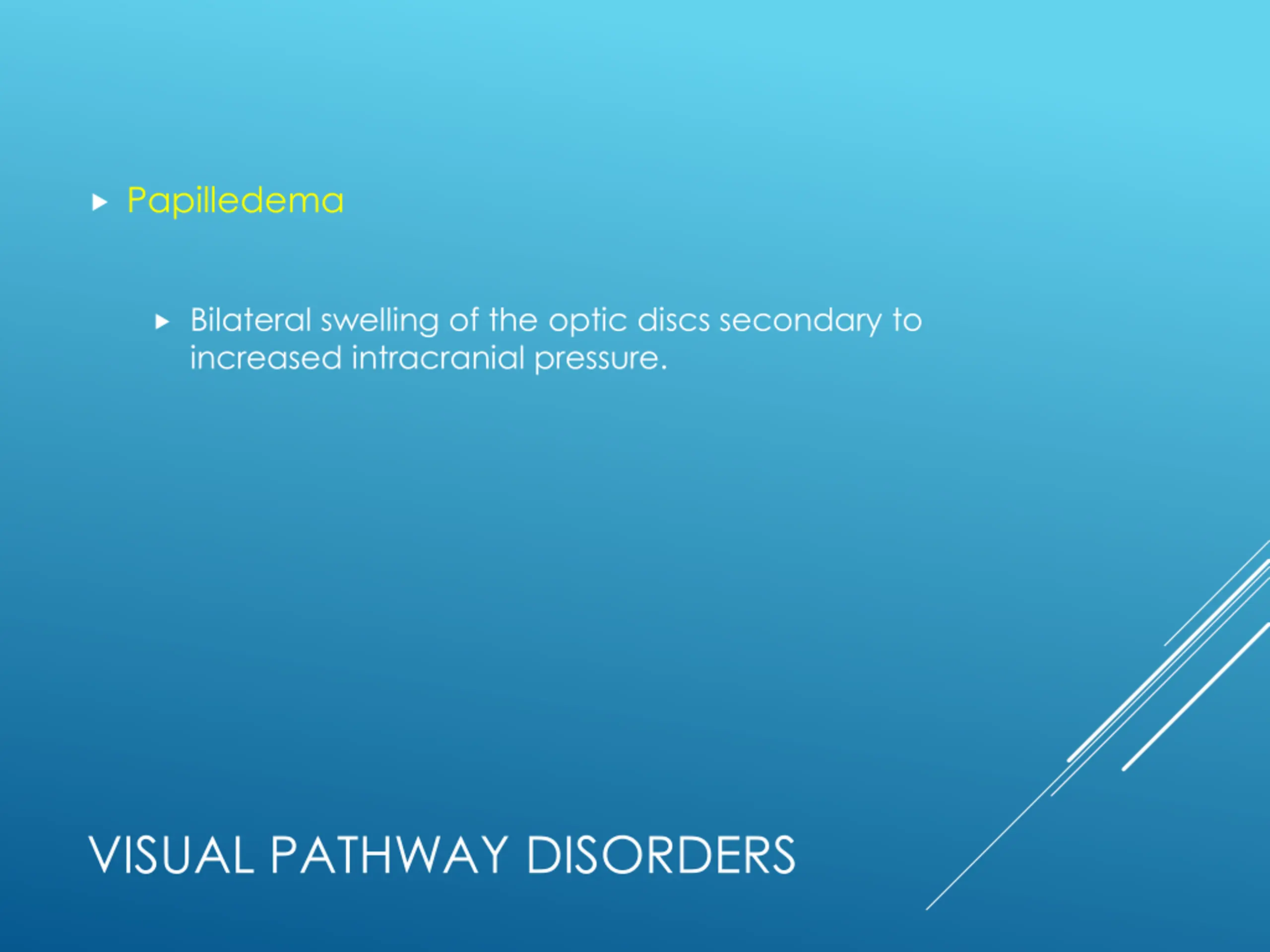 Papilledema Bilateral swelling of the optic discs secondary to increased intracranial pressure. VISUAL PATHWAY DISORDERS