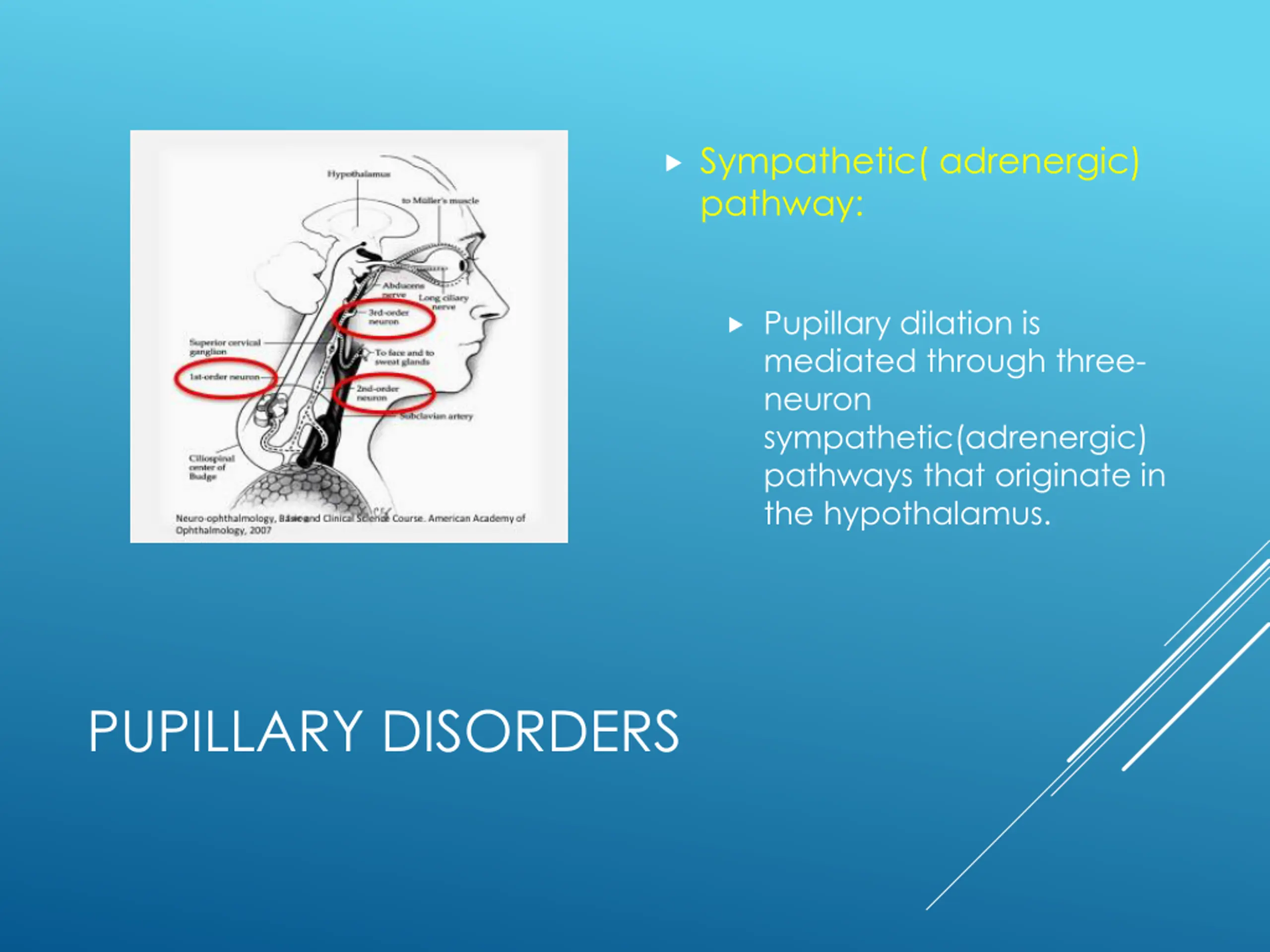 Sympathetic( adrenergic) pathway: Pupillary dilation is mediated through three- neuron sympathetic(adrenergic) pathways that originate in the hypothalamus. PUPILLARY DISORDERS