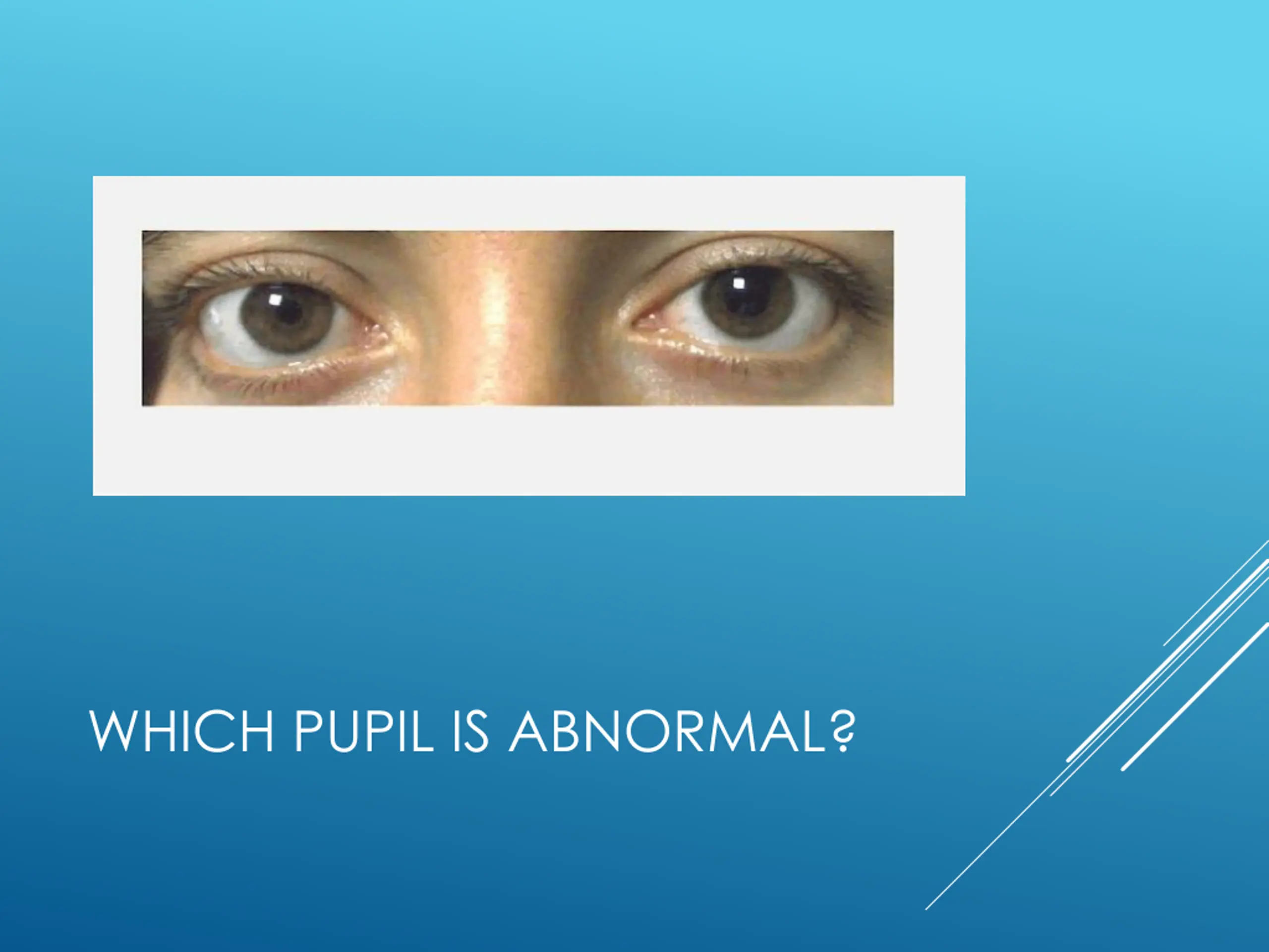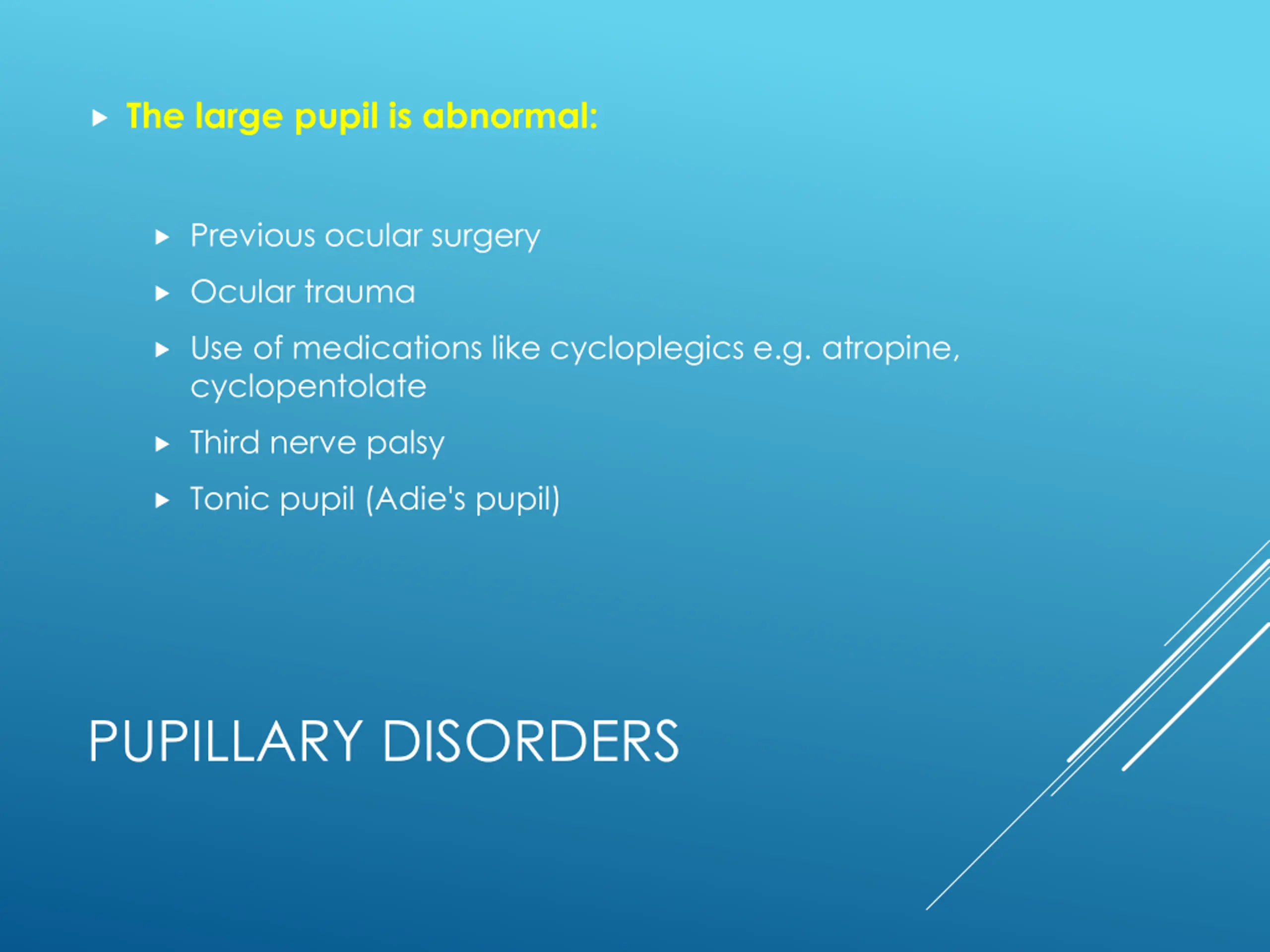 The large pupil is abnormal: Previous ocular surgery Ocular trauma Use of medications like cycloplegics e.g. atropine, cyclopentolate Third nerve palsy Tonic pupil (Adie's pupil) PUPILLARY DISORDERS