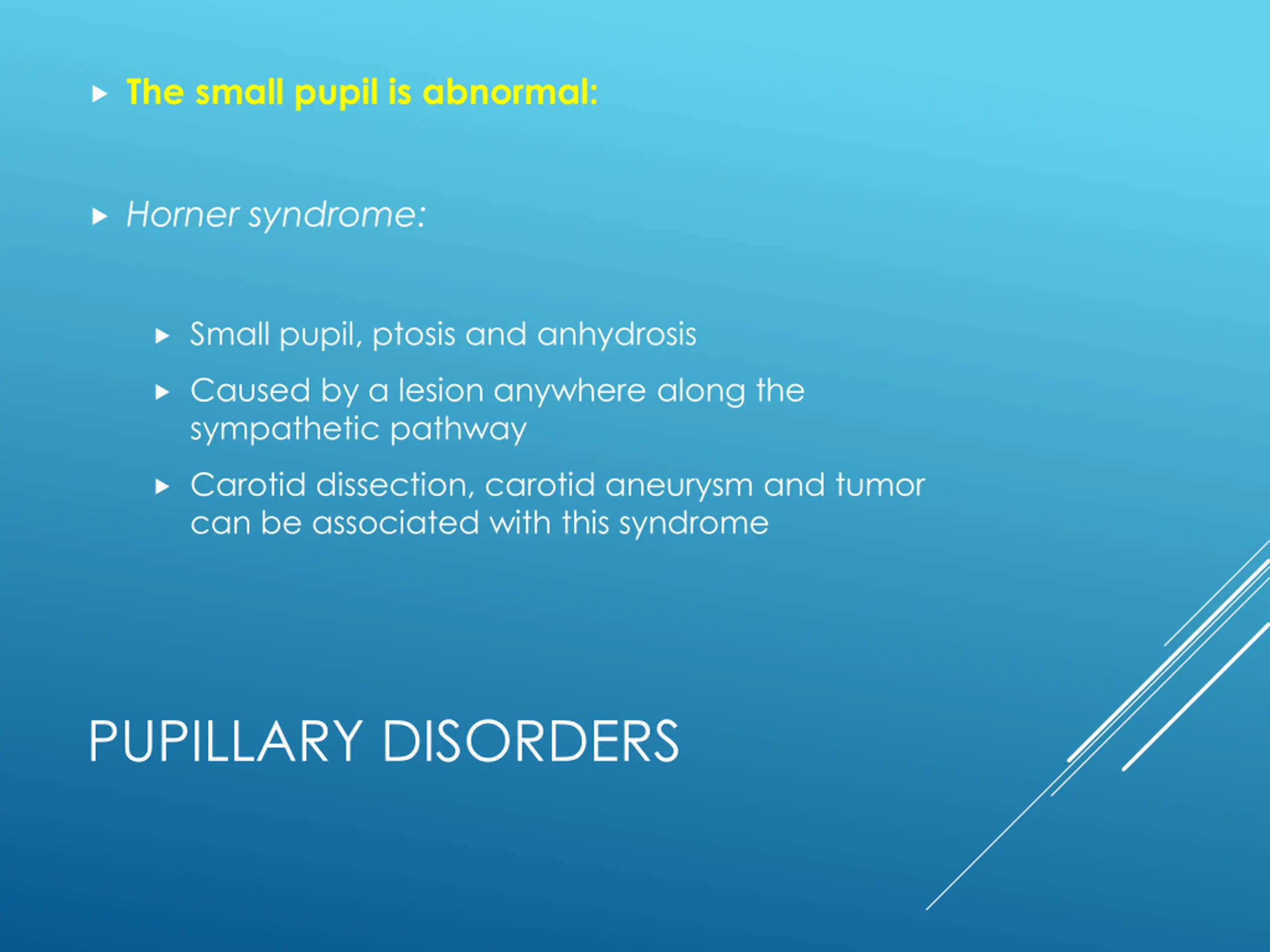 The small pupil is abnormal: Horner syndrome: Small pupil, ptosis and anhydrosis Caused by a lesion anywhere along the sympathetic pathway Carotid dissection, carotid aneurysm and tumor can be associated with this syndrome PUPILLARY DISORDERS