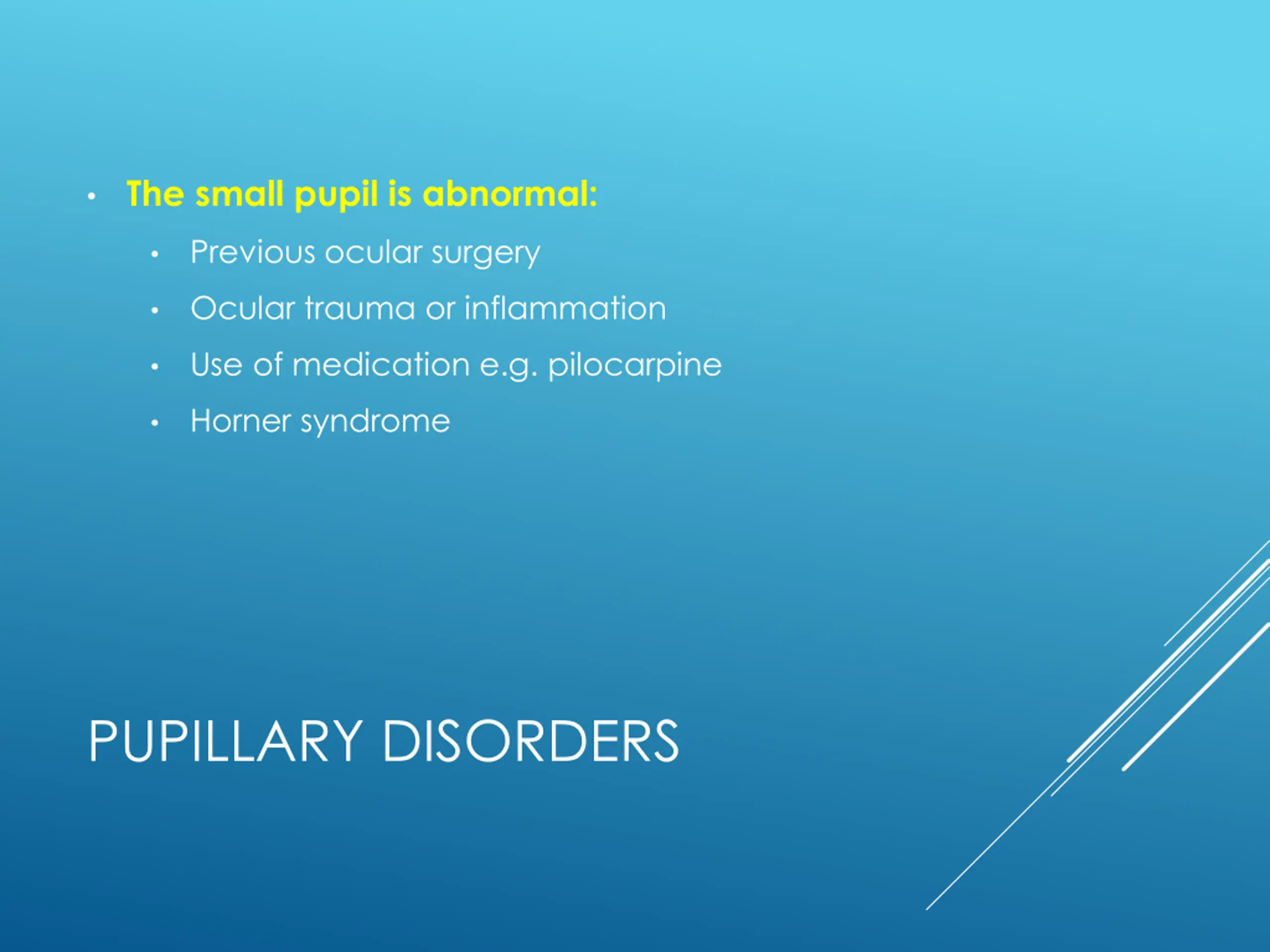 The small pupil is abnormal: Previous ocular surgery Ocular trauma or inflammation Use of medication e.g. pilocarpine Horner syndrome PUPILLARY DISORDERS
