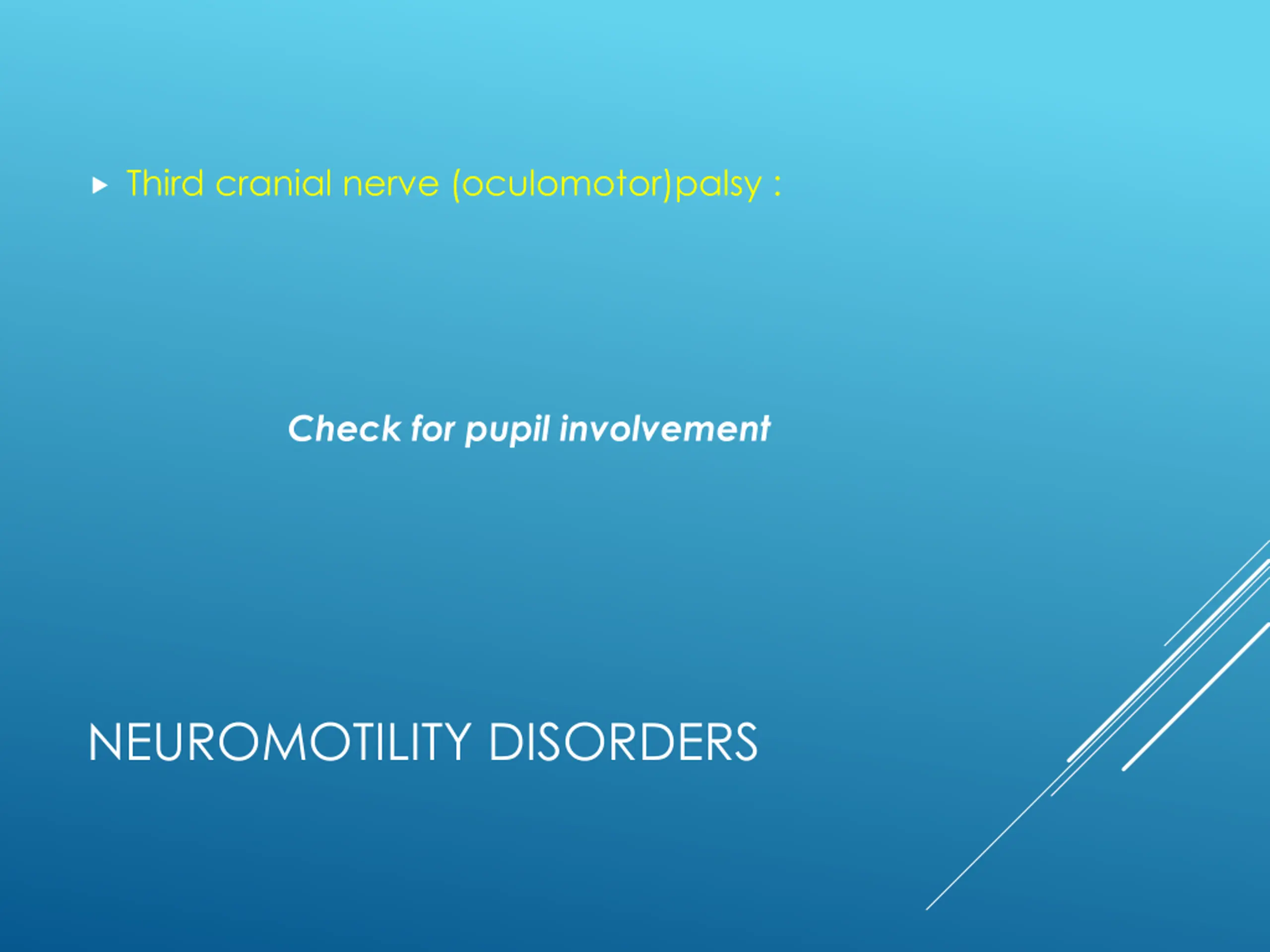 Third cranial nerve (oculomotor)palsy : Check for pupil involvement NEUROMOTILITY DISORDERS