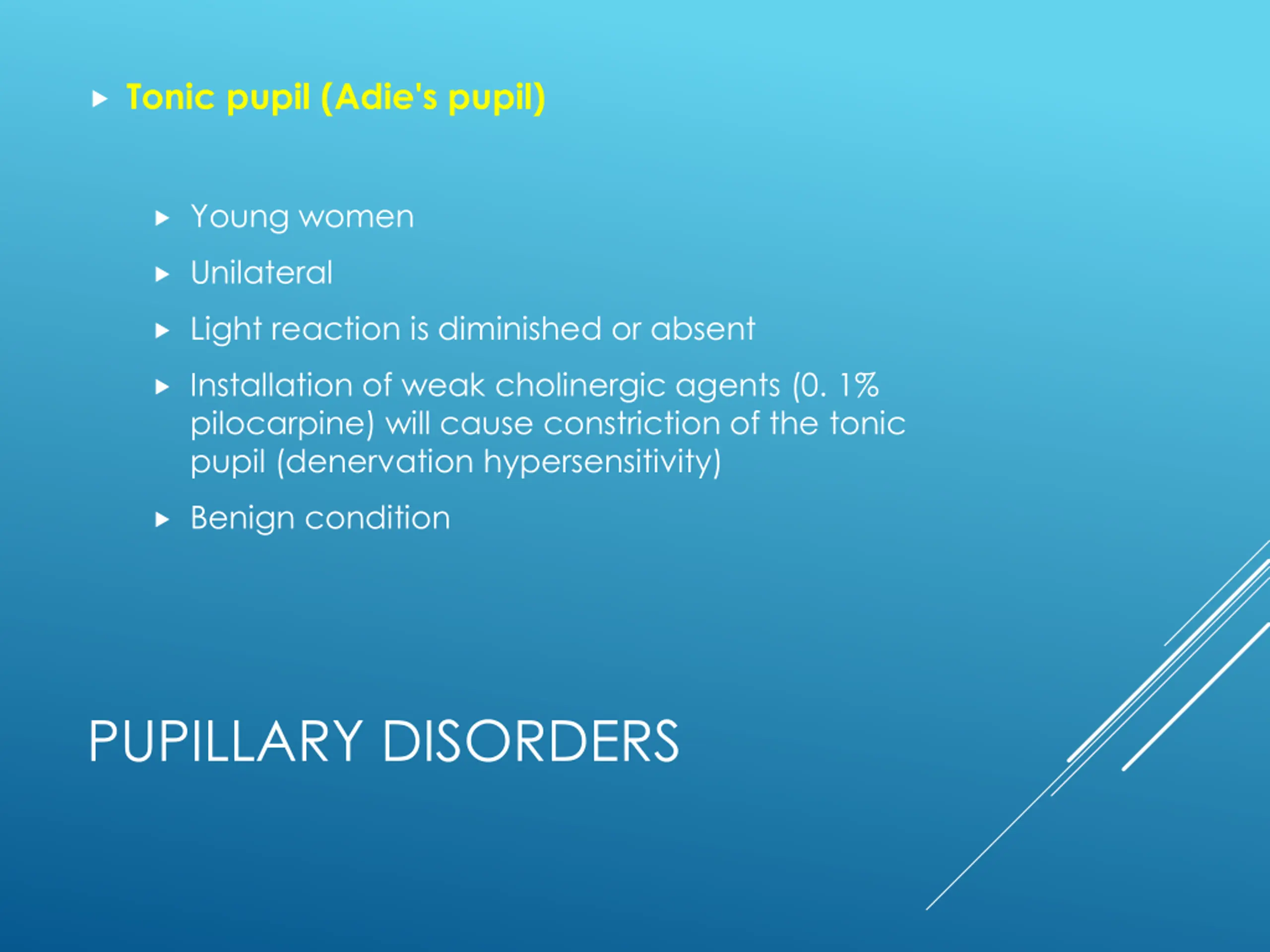 Tonic pupil (Adie's pupil) Young women Unilateral Light reaction is diminished or absent Installation of weak cholinergic agents (0. 1% pilocarpine) will cause constriction of the tonic pupil (denervation hypersensitivity) Benign condition PUPILLARY DISORDERS