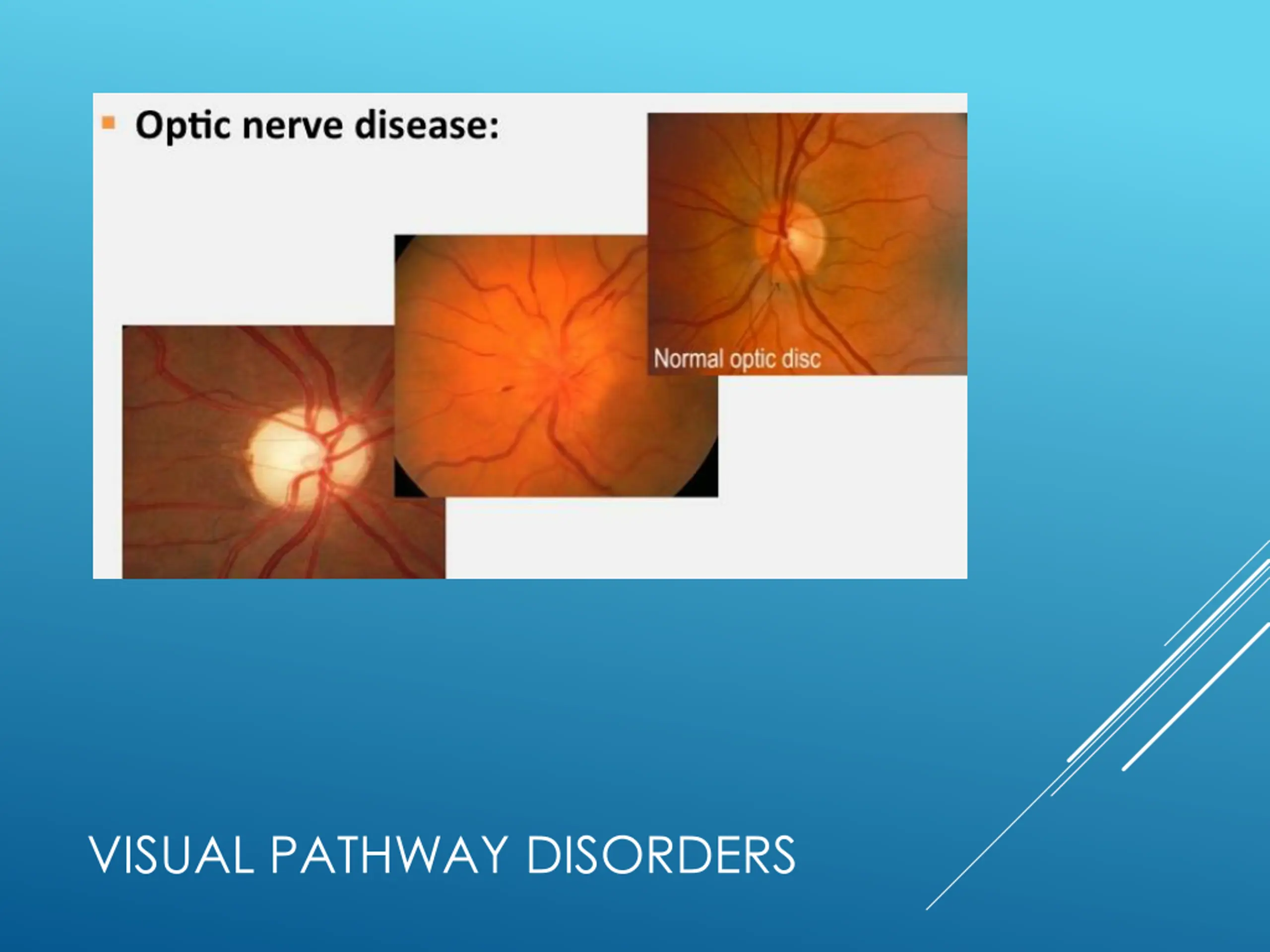 Optic nerve disease: Usually unilateral Afferent pupillary defect Central visual loss Loss of color vision Optic disc edema Optic atrophy VISUAL PATHWAY DISORDERS