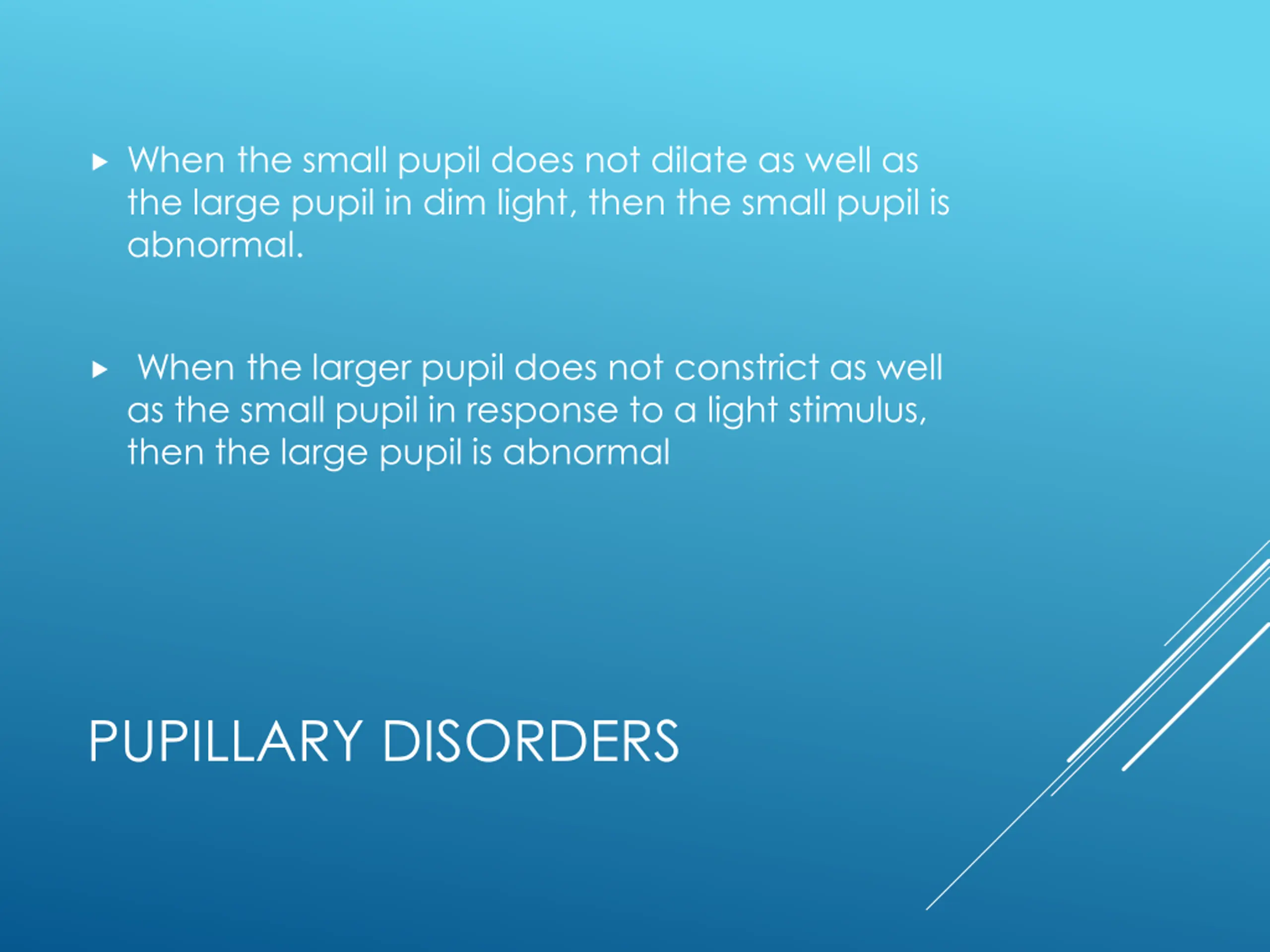 When the small pupil does not dilate as well as the large pupil in dim light, then the small pupil is abnormal. When the larger pupil does not constrict as well as the small pupil in response to a light stimulus, then the large pupil is abnormal PUPILLARY DISORDERS
