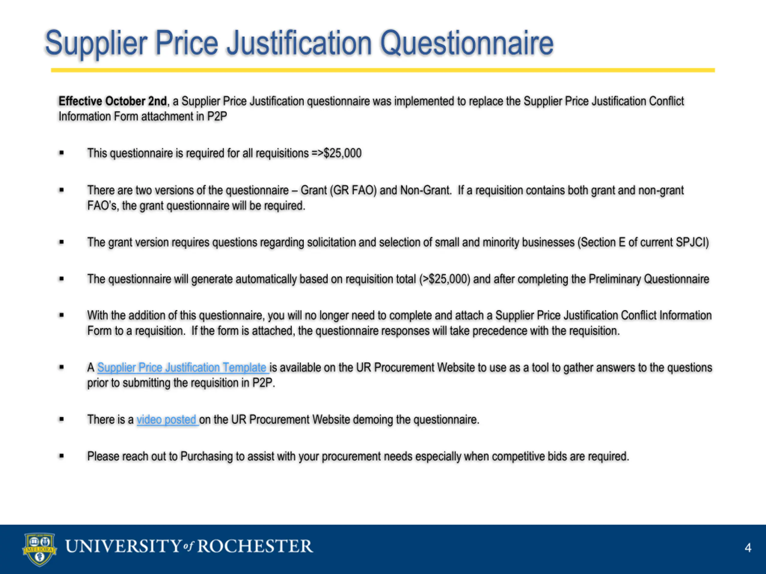 Supplier Price Justification Questionnaire Effective October 2nd, a Supplier Price Justification questionnaire was implemented to replace the Supplier Price Justification Conflict Information Form attachment in P2P This questionnaire is required for all requisitions =>$25,000 There are two versions of the questionnaire Grant (GR FAO) and Non-Grant. If a requisition contains both grant and non-grant FAO s, the grant questionnaire will be required. The grant version requires questions regarding solicitation and selection of small and minority businesses (Section E of current SPJCI) The questionnaire will generate automatically based on requisition total (>$25,000) and after completing the Preliminary Questionnaire With the addition of this questionnaire, you will no longer need to complete and attach a Supplier Price Justification Conflict Information Form to a requisition. If the form is attached, the questionnaire responses will take precedence with the requisition. A Supplier Price Justification Template is available on the UR Procurement Website to use as a tool to gather answers to the questions prior to submitting the requisition in P2P. There is a video posted on the UR Procurement Website demoing the questionnaire. Please reach out to Purchasing to assist with your procurement needs especially when competitive bids are required. 4