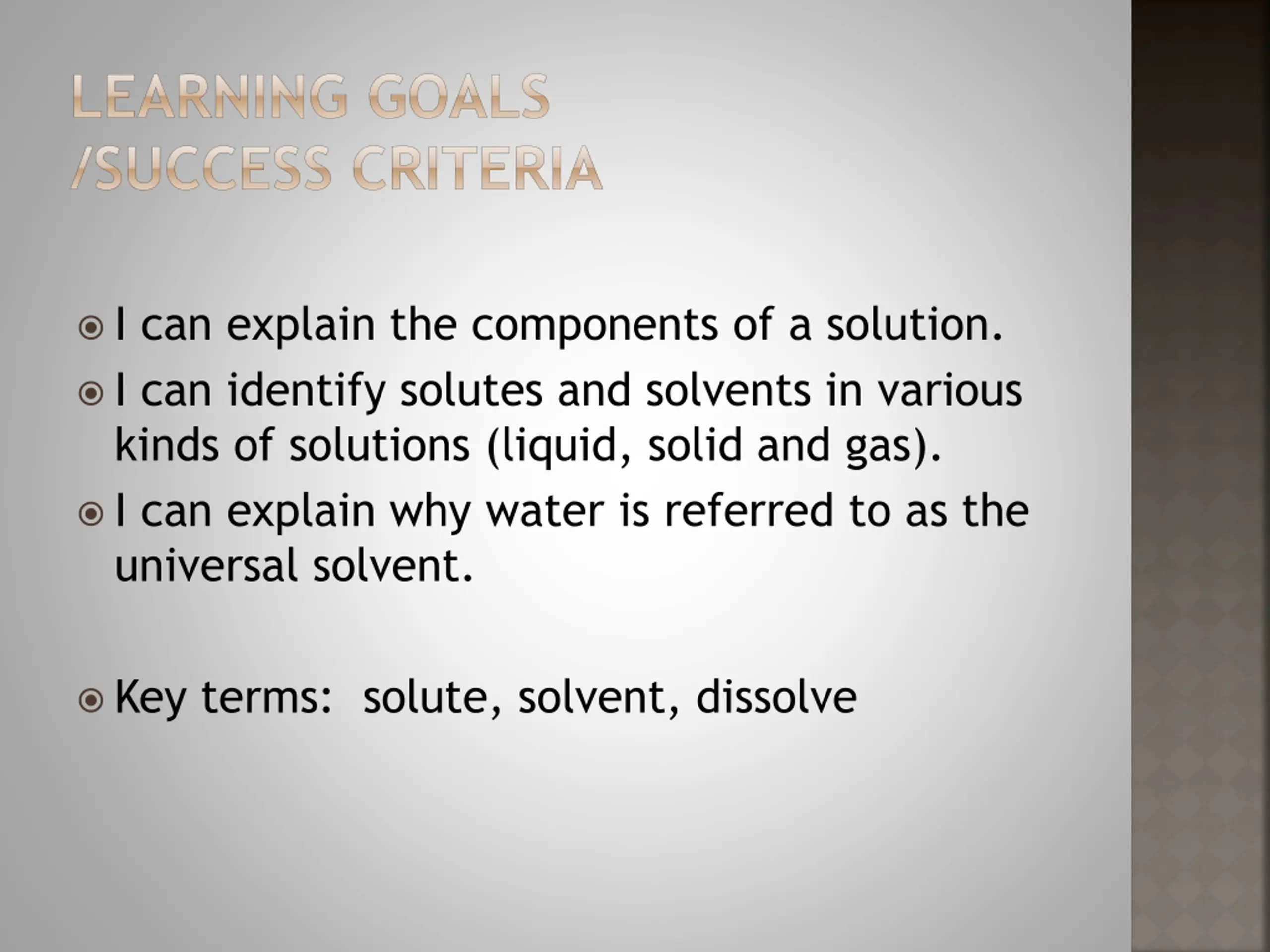 LEARNING GOALS /SUCCESS CRITERIA I can explain the components of a solution. I can identify solutes and solvents in various kinds of solutions (liquid, solid and gas). I can explain why water is referred to as the universal solvent. Key terms: solute, solvent, dissolve