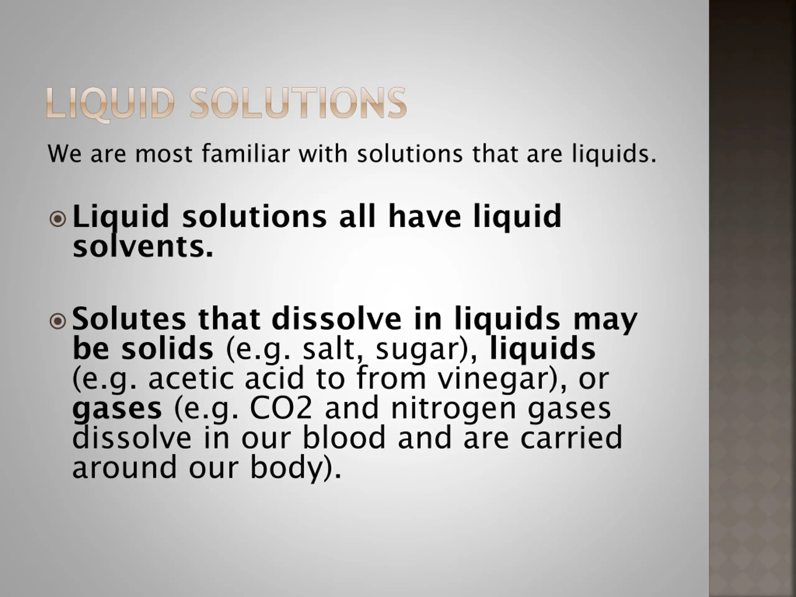 LIQUID SOLUTIONS We are most familiar with solutions that are liquids. Liquid solutions all have liquid solvents. Solutes that dissolve in liquids may be solids (e.g. salt, sugar), liquids (e.g. acetic acid to from vinegar), or gases (e.g. CO2 and nitrogen gases dissolve in our blood and are carried around our body).