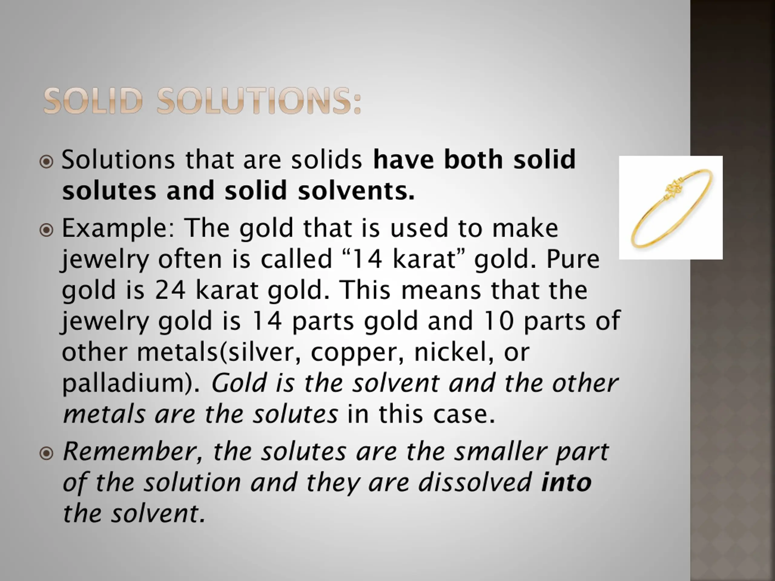 SOLID SOLUTIONS: Solutions that are solids have both solid solutes and solid solvents. Example: The gold that is used to make jewelry often is called 14 karat gold. Pure gold is 24 karat gold. This means that the jewelry gold is 14 parts gold and 10 parts of other metals(silver, copper, nickel, or palladium). Gold is the solvent and the other metals are the solutes in this case. Remember, the solutes are the smaller part of the solution and they are dissolved into the solvent.