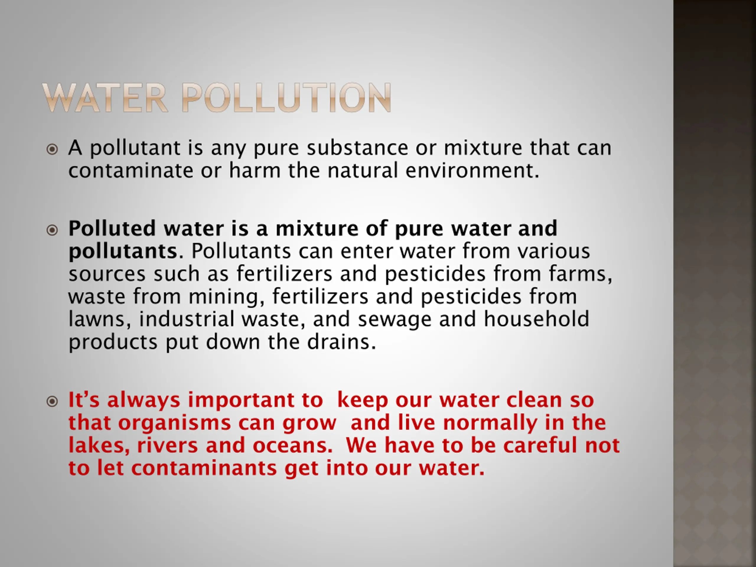 WATER POLLUTION A pollutant is any pure substance or mixture that can contaminate or harm the natural environment. Polluted water is a mixture of pure water and pollutants. Pollutants can enter water from various sources such as fertilizers and pesticides from farms, waste from mining, fertilizers and pesticides from lawns, industrial waste, and sewage and household products put down the drains. It s always important to keep our water clean so that organisms can grow and live normally in the lakes, rivers and oceans. We have to be careful not to let contaminants get into our water.