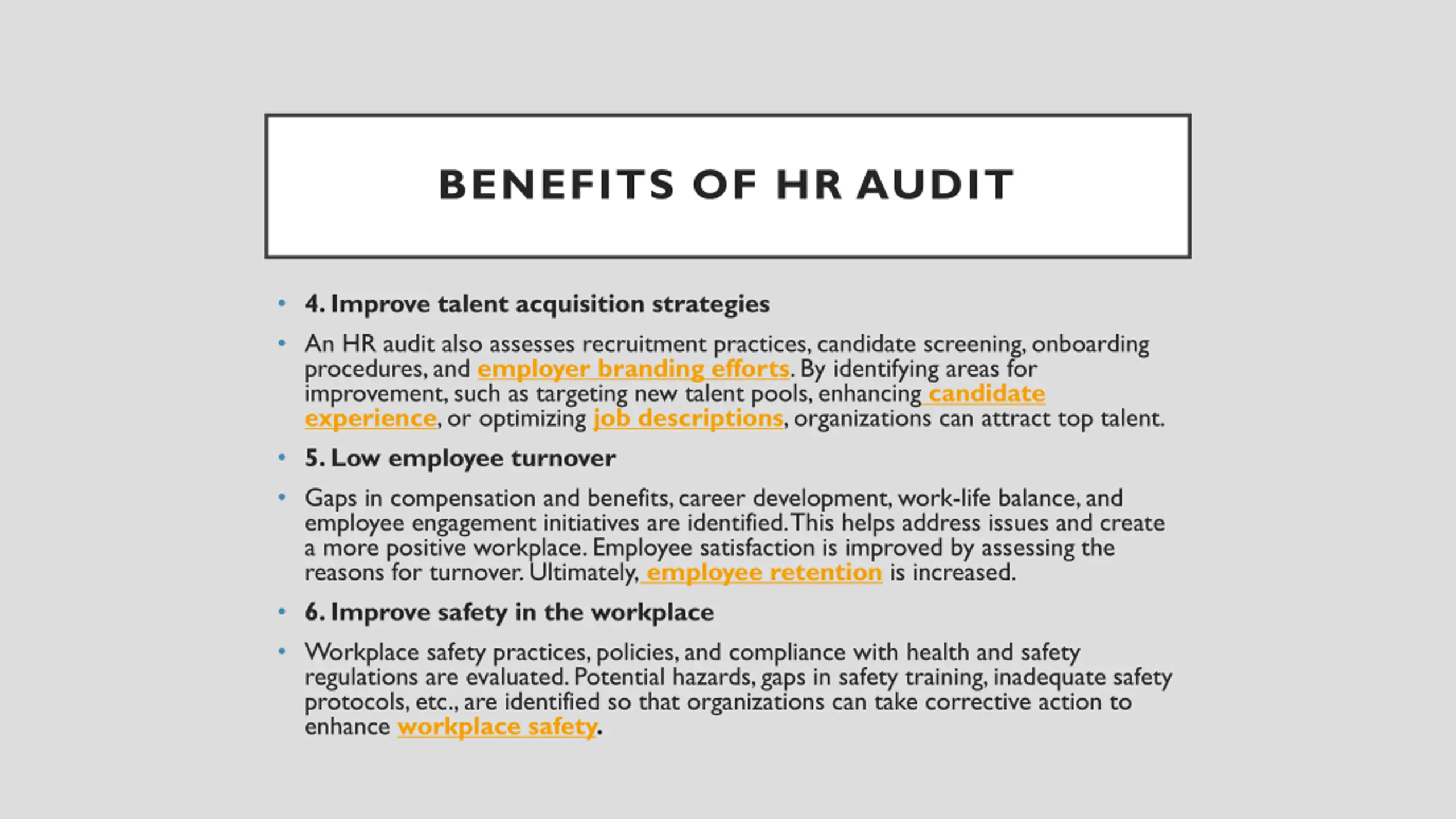 BENEFITS OF HR AUDIT 4. Improve talent acquisition strategies An HR audit also assesses recruitment practices, candidate screening, onboarding procedures, and employer branding efforts. By identifying areas for improvement, such as targeting new talent pools, enhancing candidate experience, or optimizing job descriptions, organizations can attract top talent. 5. Low employee turnover Gaps in compensation and benefits, career development, work-life balance, and employee engagement initiatives are identified. This helps address issues and create a more positive workplace. Employee satisfaction is improved by assessing the reasons for turnover. Ultimately, employee retention is increased. 6. Improve safety in the workplace Workplace safety practices, policies, and compliance with health and safety regulations are evaluated. Potential hazards, gaps in safety training, inadequate safety protocols, etc., are identified so that organizations can take corrective action to enhance workplace safety.
