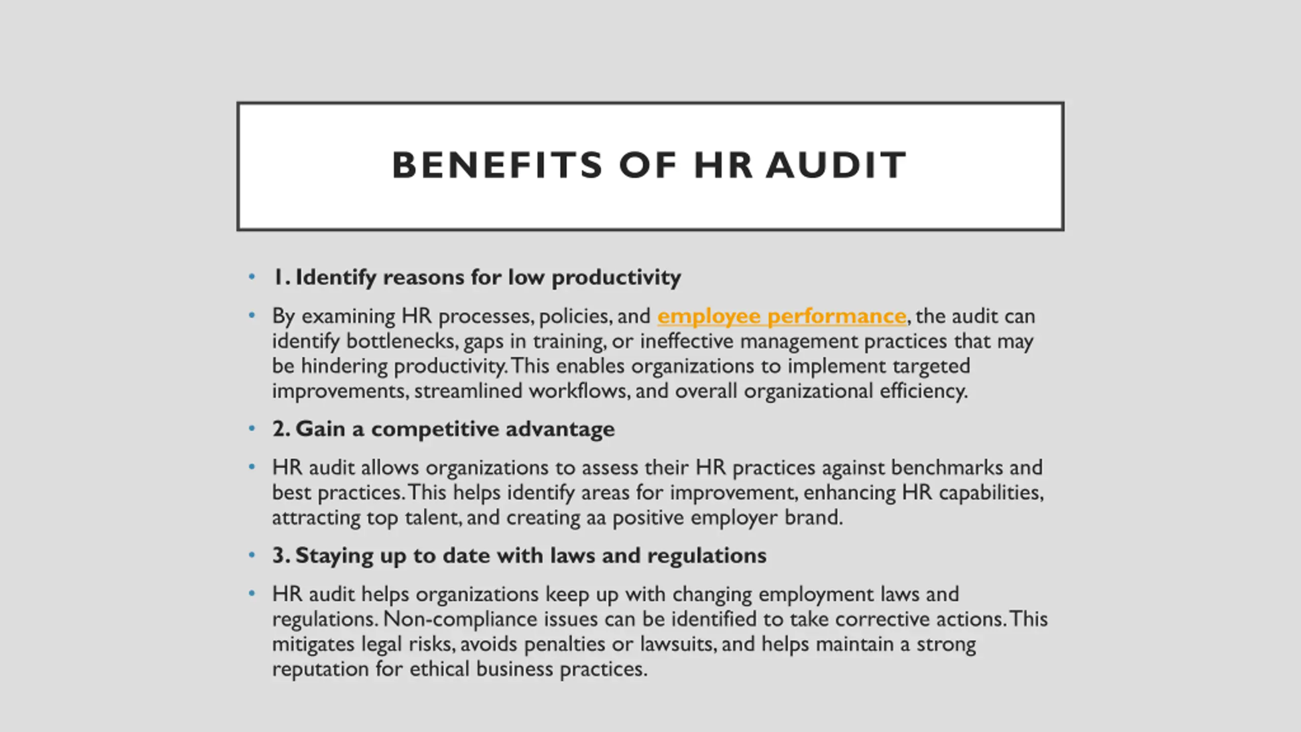 BENEFITS OF HR AUDIT 1. Identify reasons for low productivity By examining HR processes, policies, and employee performance, the audit can identify bottlenecks, gaps in training, or ineffective management practices that may be hindering productivity. This enables organizations to implement targeted improvements, streamlined workflows, and overall organizational efficiency. 2. Gain a competitive advantage HR audit allows organizations to assess their HR practices against benchmarks and best practices. This helps identify areas for improvement, enhancing HR capabilities, attracting top talent, and creating aa positive employer brand. 3. Staying up to date with laws and regulations HR audit helps organizations keep up with changing employment laws and regulations. Non-compliance issues can be identified to take corrective actions. This mitigates legal risks, avoids penalties or lawsuits, and helps maintain a strong reputation for ethical business practices.