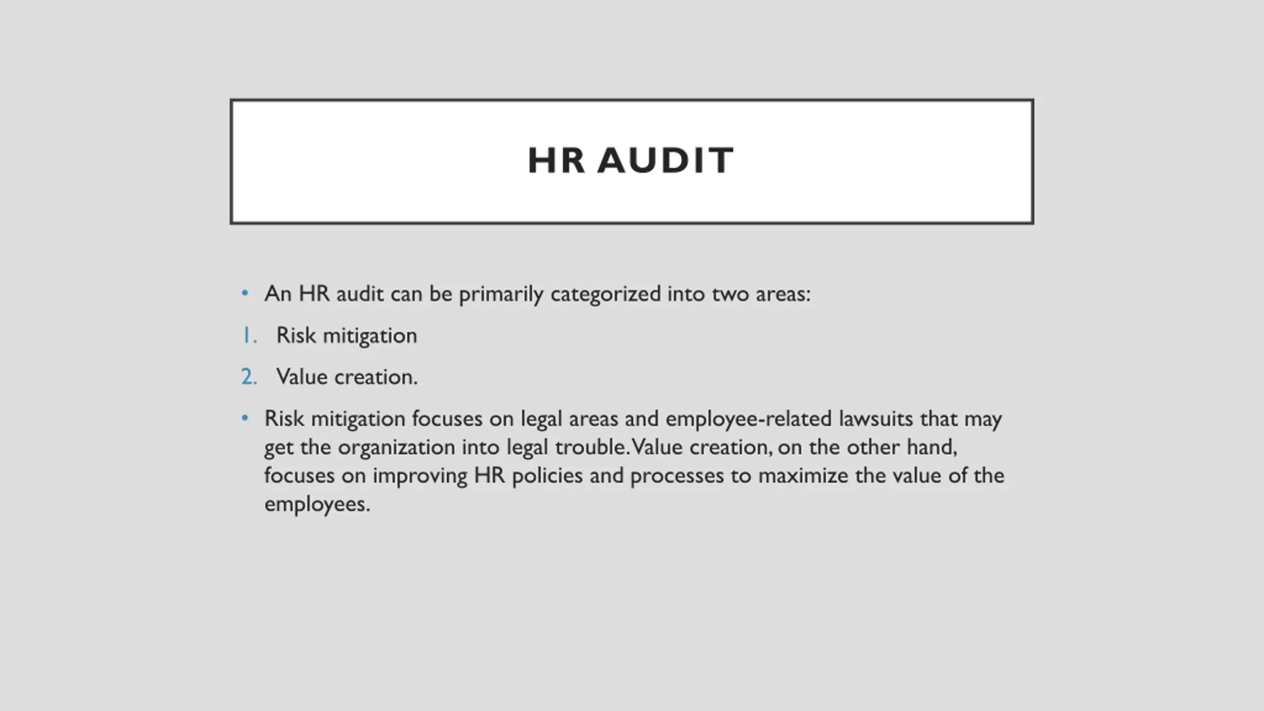HR AUDIT An HR audit can be primarily categorized into two areas: 1. Risk mitigation 2. Value creation. Risk mitigation focuses on legal areas and employee-related lawsuits that may get the organization into legal trouble. Value creation, on the other hand, focuses on improving HR policies and processes to maximize the value of the employees.