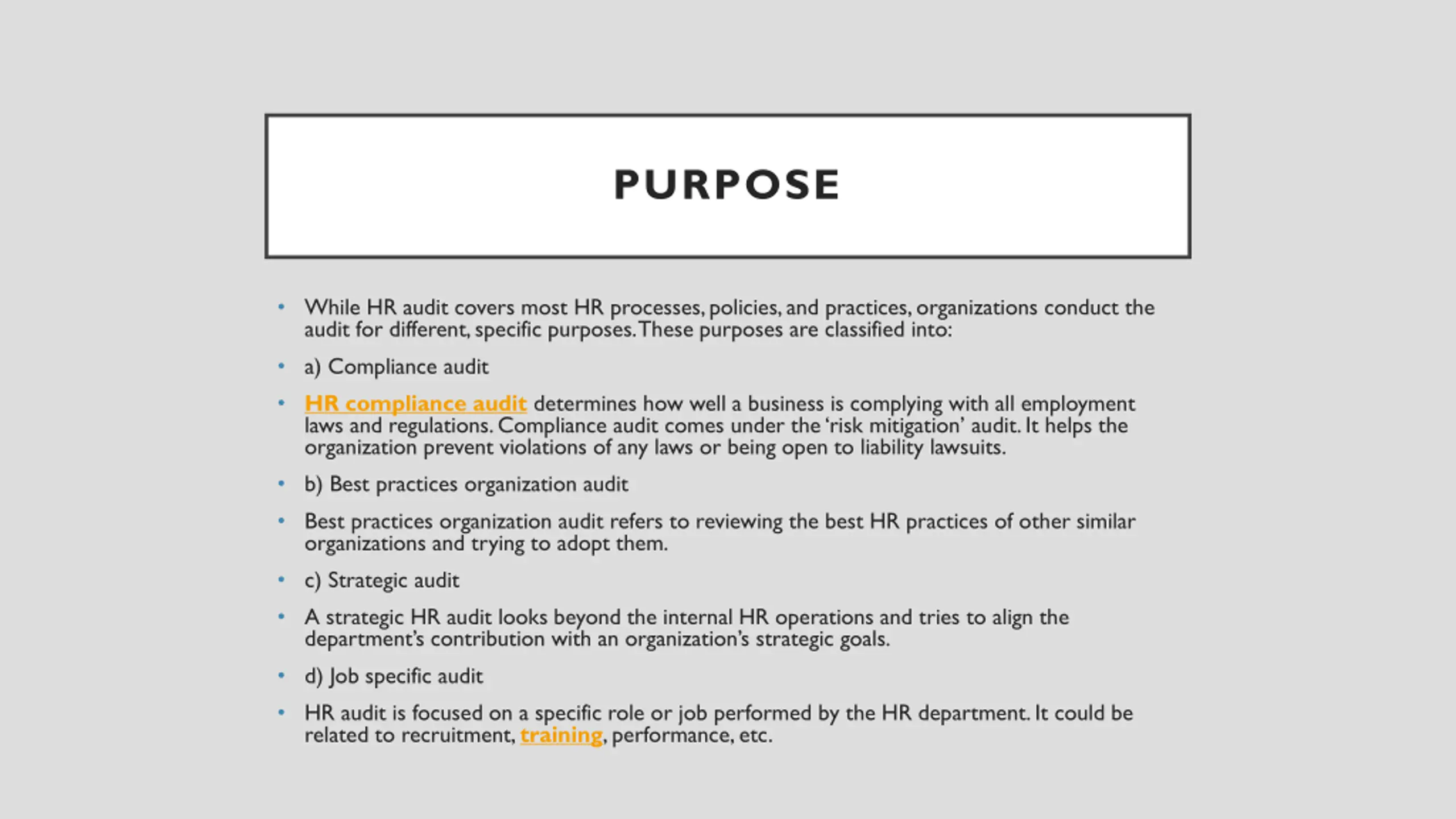 PURPOSE While HR audit covers most HR processes, policies, and practices, organizations conduct the audit for different, specific purposes. These purposes are classified into: a) Compliance audit HR compliance audit determines how well a business is complying with all employment laws and regulations. Compliance audit comes under the risk mitigation audit. It helps the organization prevent violations of any laws or being open to liability lawsuits. b) Best practices organization audit Best practices organization audit refers to reviewing the best HR practices of other similar organizations and trying to adopt them. c) Strategic audit A strategic HR audit looks beyond the internal HR operations and tries to align the department s contribution with an organization s strategic goals. d) Job specific audit HR audit is focused on a specific role or job performed by the HR department. It could be related to recruitment,training, performance, etc.