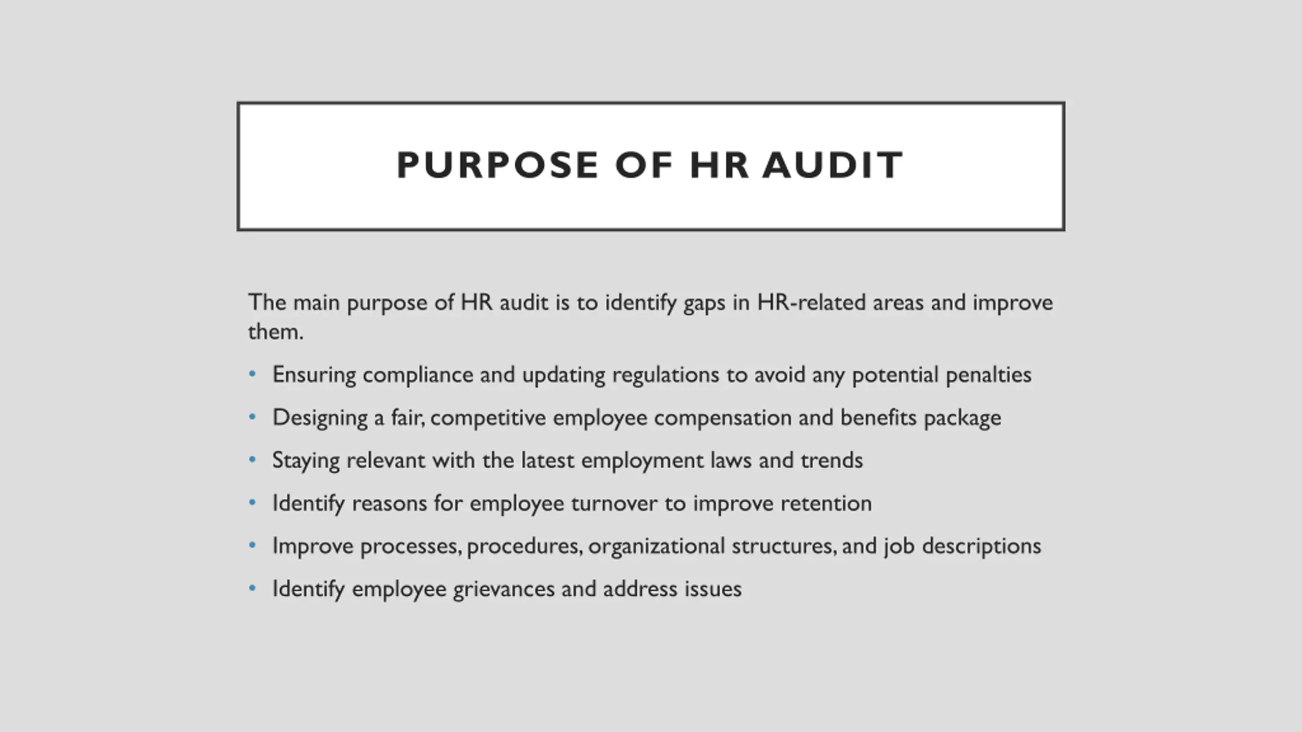 PURPOSE OF HR AUDIT The main purpose of HR audit is to identify gaps in HR-related areas and improve them. Ensuring compliance and updating regulations to avoid any potential penalties Designing a fair, competitive employee compensation and benefits package Staying relevant with the latest employment laws and trends Identify reasons for employee turnover to improve retention Improve processes, procedures, organizational structures, and job descriptions Identify employee grievances and address issues