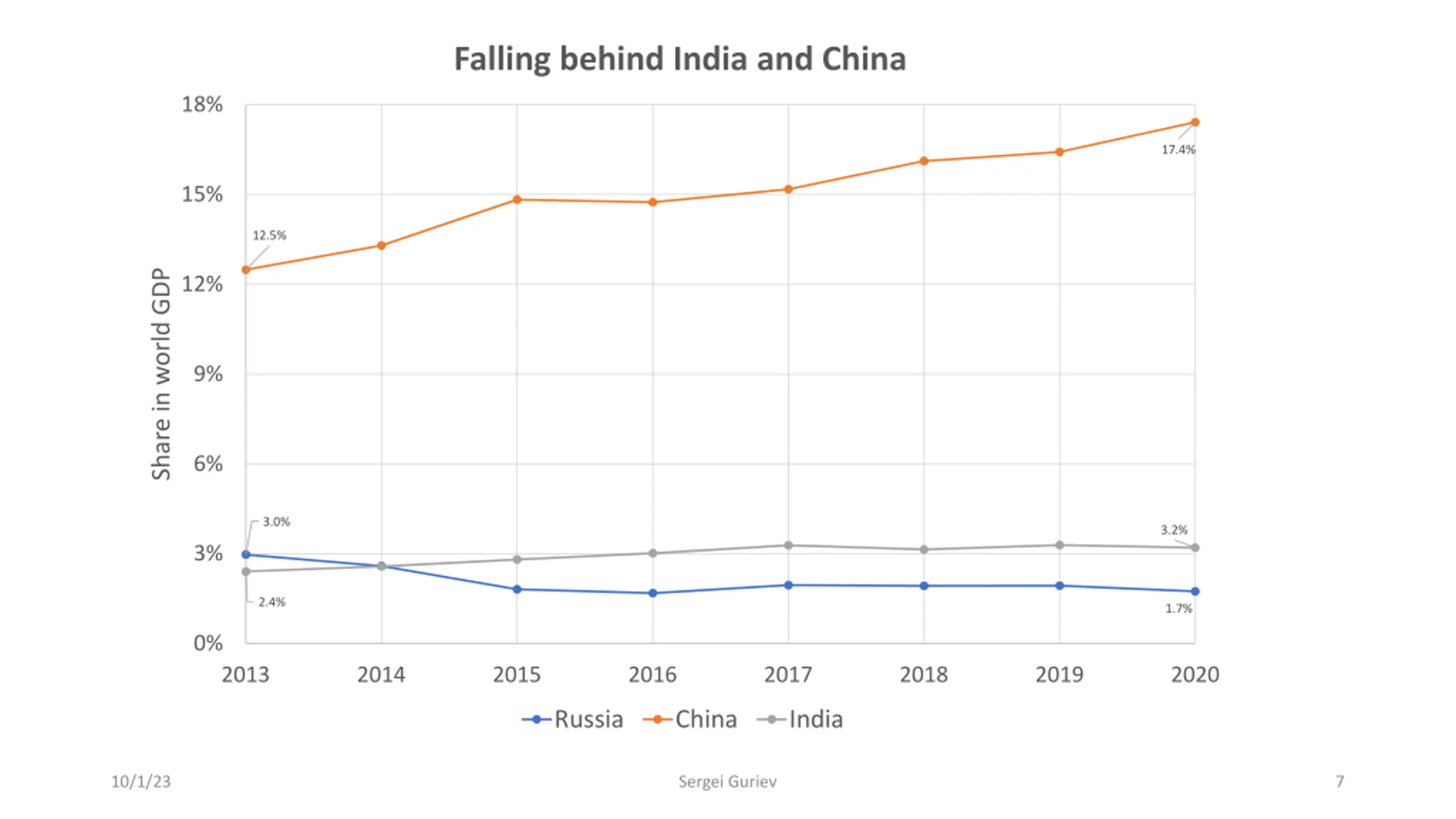 Falling behind India and China 18% 17.4% 15% 12.5% Share in world GDP 12% 9% 6% 3.0% 3.2% 3% 2.4% 1.7% 0% 2013 2014 2015 2016 2017 2018 2019 2020 Russia China India 10/1/23 Sergei Guriev 7