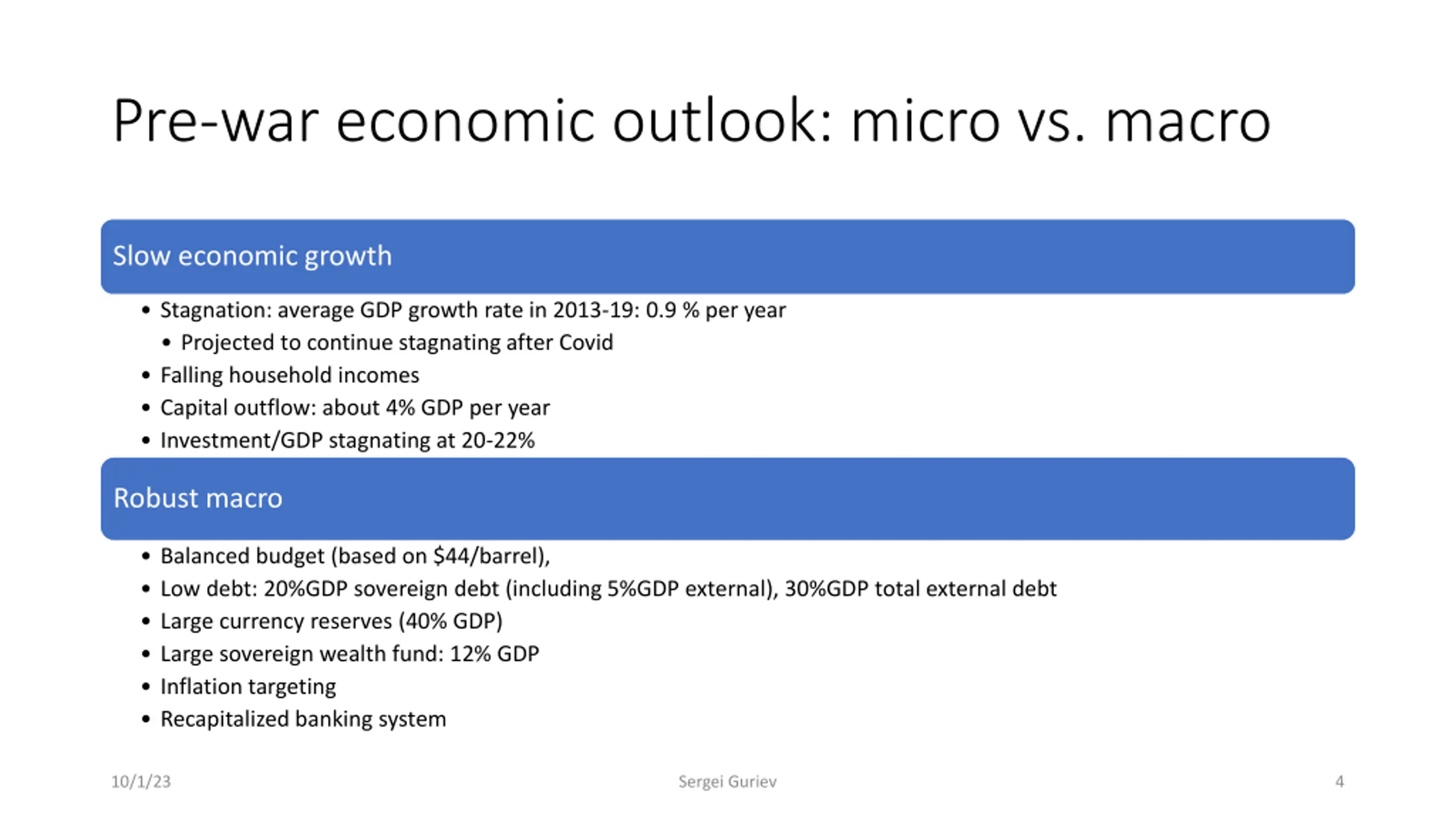Pre-war economic outlook: micro vs. macro Slow economic growth Stagnation: average GDP growth rate in 2013-19: 0.9 % per year Projected to continue stagnating after Covid Falling household incomes Capital outflow: about 4% GDP per year Investment/GDP stagnating at 20-22% Robust macro Balanced budget (based on $44/barrel), Low debt: 20%GDP sovereign debt (including 5%GDP external), 30%GDP total external debt Large currency reserves (40% GDP) Large sovereign wealth fund: 12% GDP Inflation targeting Recapitalized banking system 10/1/23 Sergei Guriev 4