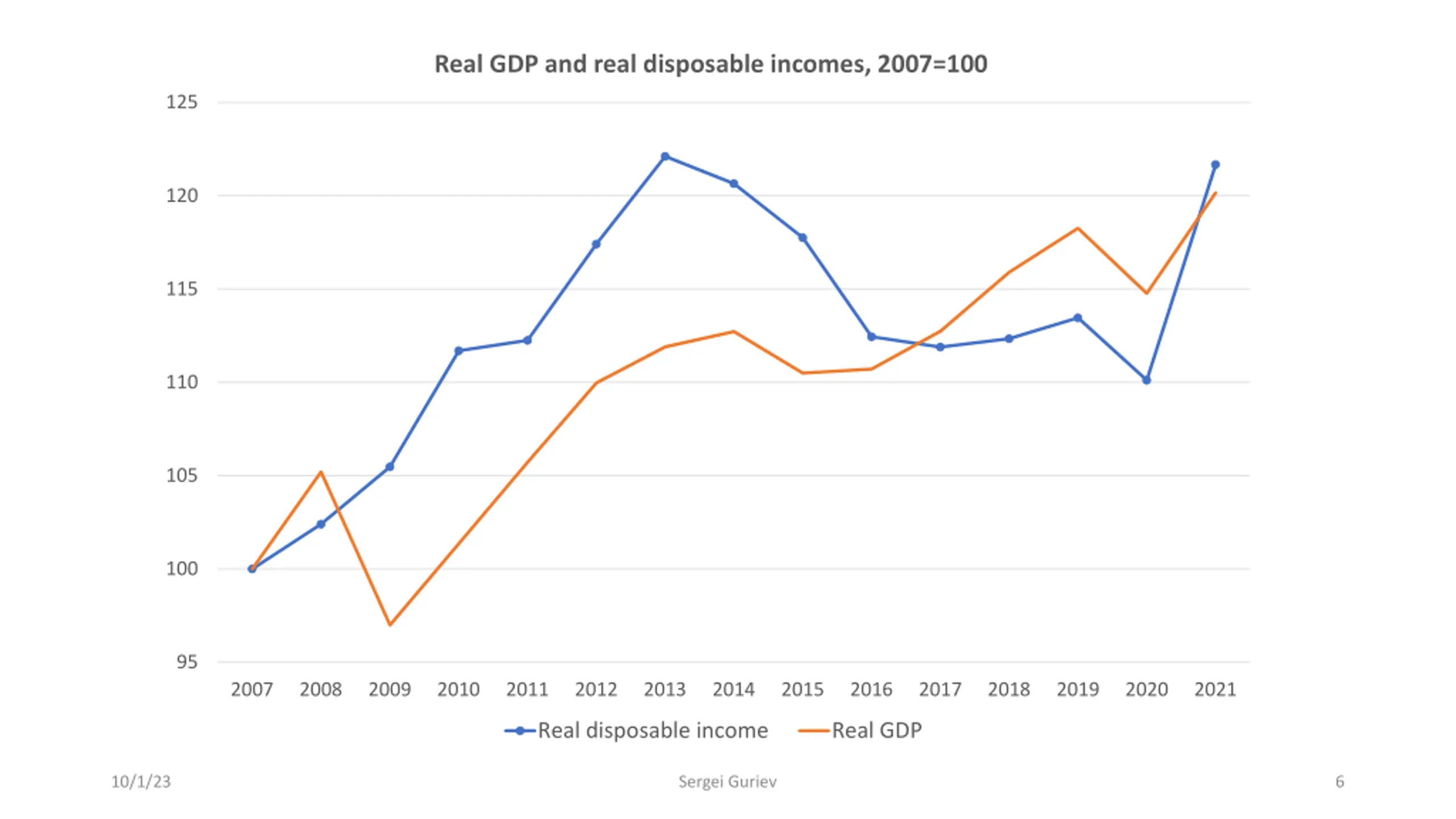 Real GDP and real disposable incomes, 2007=100 125 120 115 110 105 100 95 2007 2008 2009 2010 2011 2012 2013 2014 2015 2016 2017 2018 2019 2020 2021 Real disposable income Real GDP 10/1/23 Sergei Guriev 6