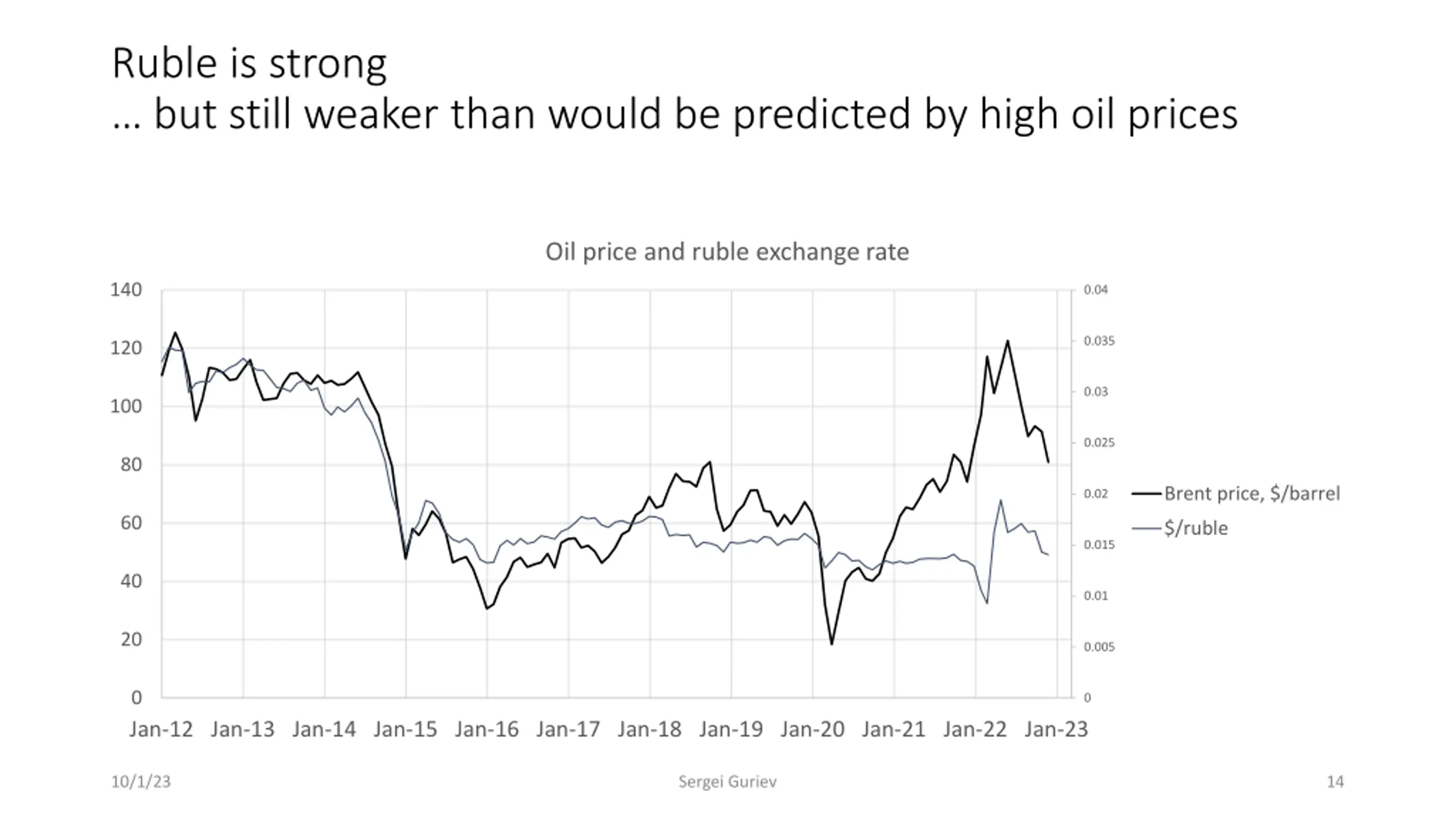 Ruble is strong but still weaker than would be predicted by high oil prices Oil price and ruble exchange rate 140 0.04 0.035 120 0.03 100 0.025 80 Brent price, $/barrel 0.02 60 $/ruble 0.015 40 0.01 20 0.005 0 Jan-12 Jan-13 Jan-14 Jan-15 Jan-16 Jan-17 Jan-18 Jan-19 Jan-20 Jan-21 Jan-22 Jan-23 0 10/1/23 Sergei Guriev 14