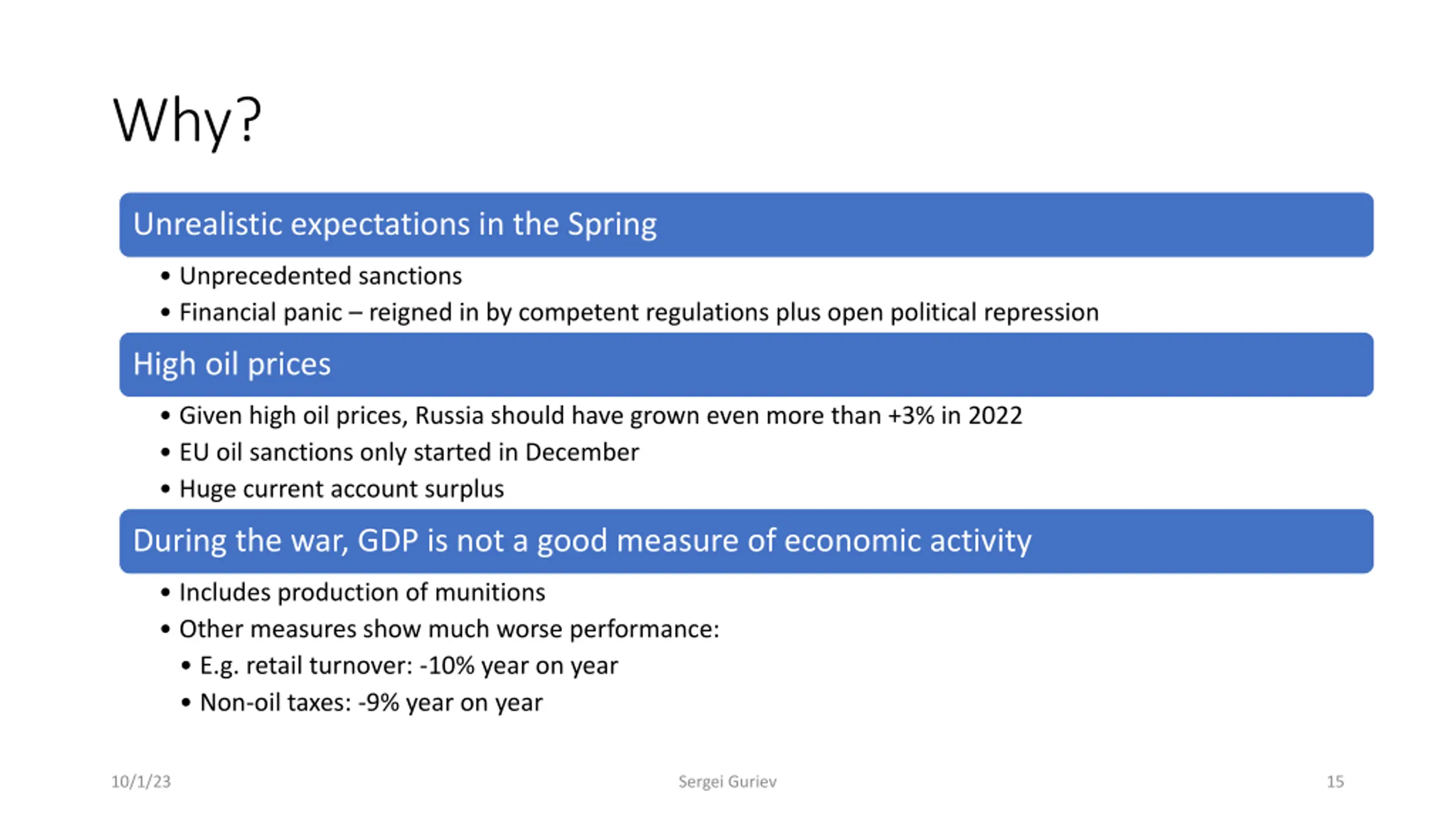 Why? Unrealistic expectations in the Spring Unprecedented sanctions Financial panic reigned in by competent regulations plus open political repression High oil prices Given high oil prices, Russia should have grown even more than +3% in 2022 EU oil sanctions only started in December Huge current account surplus During the war, GDP is not a good measure of economic activity Includes production of munitions Other measures show much worse performance: E.g. retail turnover: -10% year on year Non-oil taxes: -9% year on year 10/1/23 Sergei Guriev 15