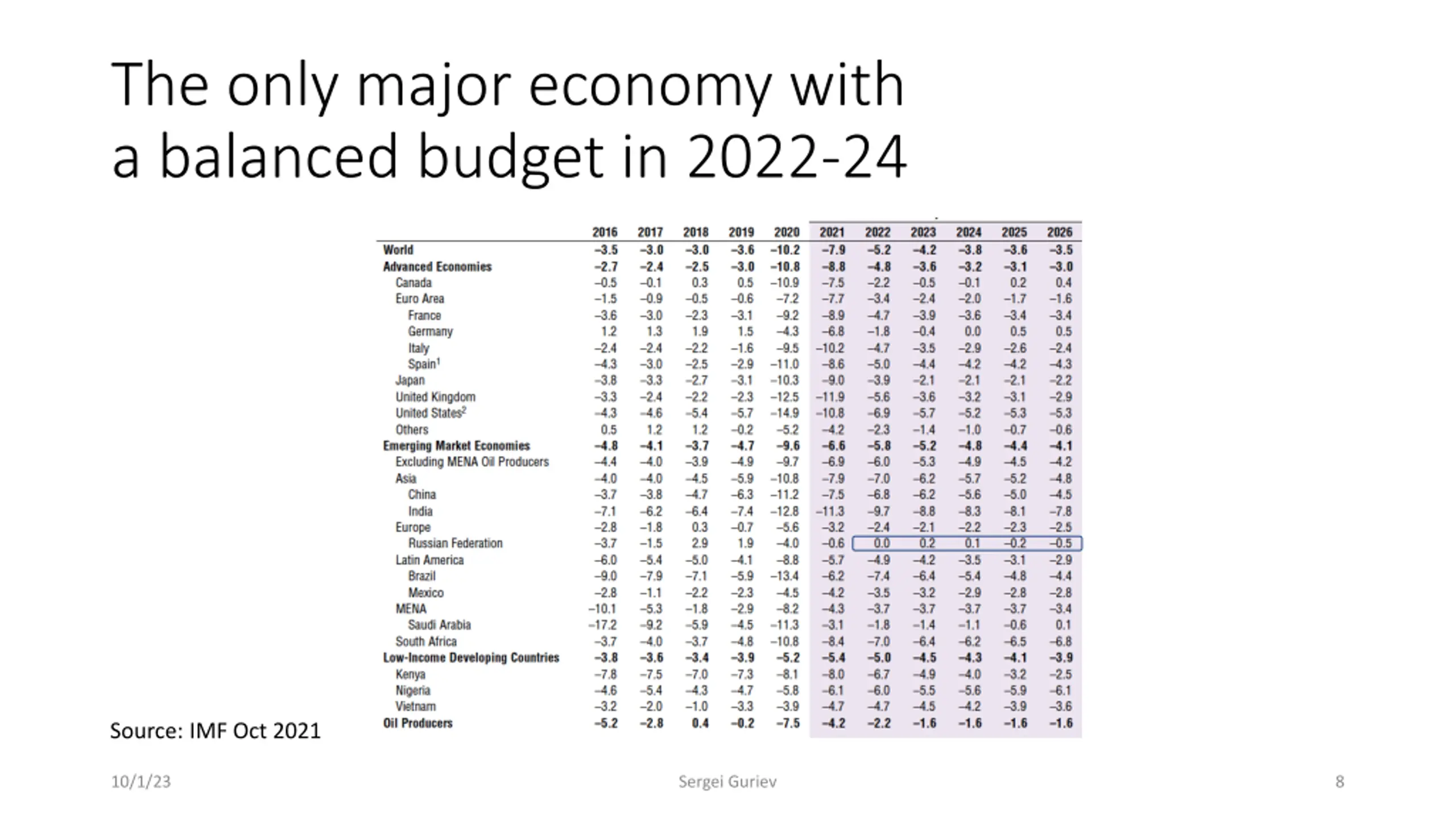 The only major economy with a balanced budget in 2022-24 Source: IMF Oct 2021 10/1/23 Sergei Guriev 8