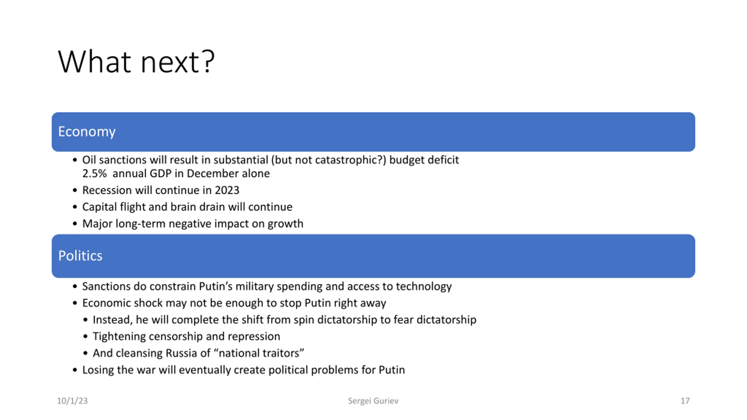 Pre-war sanctions: very minor impact Survey by Korhonen (2019) Paper Period Effect on GDP IMF (2019) 2014-18 1% Pestova and Mamonov (2019 2014-15 1.2% Kholodilin and Net unajev (2019) 2014-16 No effect Barsegyan (2019) 2014-17 1.5% in total Impact on trade Crozet and Hinz (2020): 7% reduction in exports for Russia, 0.3% reduction in exports for the West Micro studies Ahn and Ludema (2020) The sword and the shield : targeted firms suffer but state s protection of strategic firms helps Countersanctions Volchkova and Kuznetsova (2019): 0.5% GDP annual loss of consumer surplus, 0.05%GDP deadweight loss 10/1/23 Sergei Guriev 10