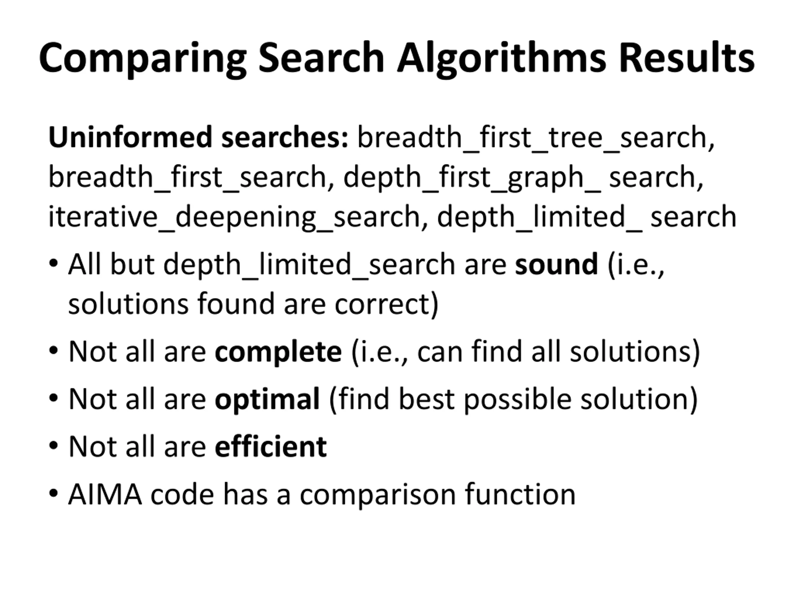 Comparing Search Algorithms Results Uninformed searches: breadth_first_tree_search, breadth_first_search, depth_first_graph_ search, iterative_deepening_search, depth_limited_ search All but depth_limited_search are sound (i.e., solutions found are correct) Not all are complete (i.e., can find all solutions) Not all are optimal (find best possible solution) Not all are efficient AIMA code has a comparison function