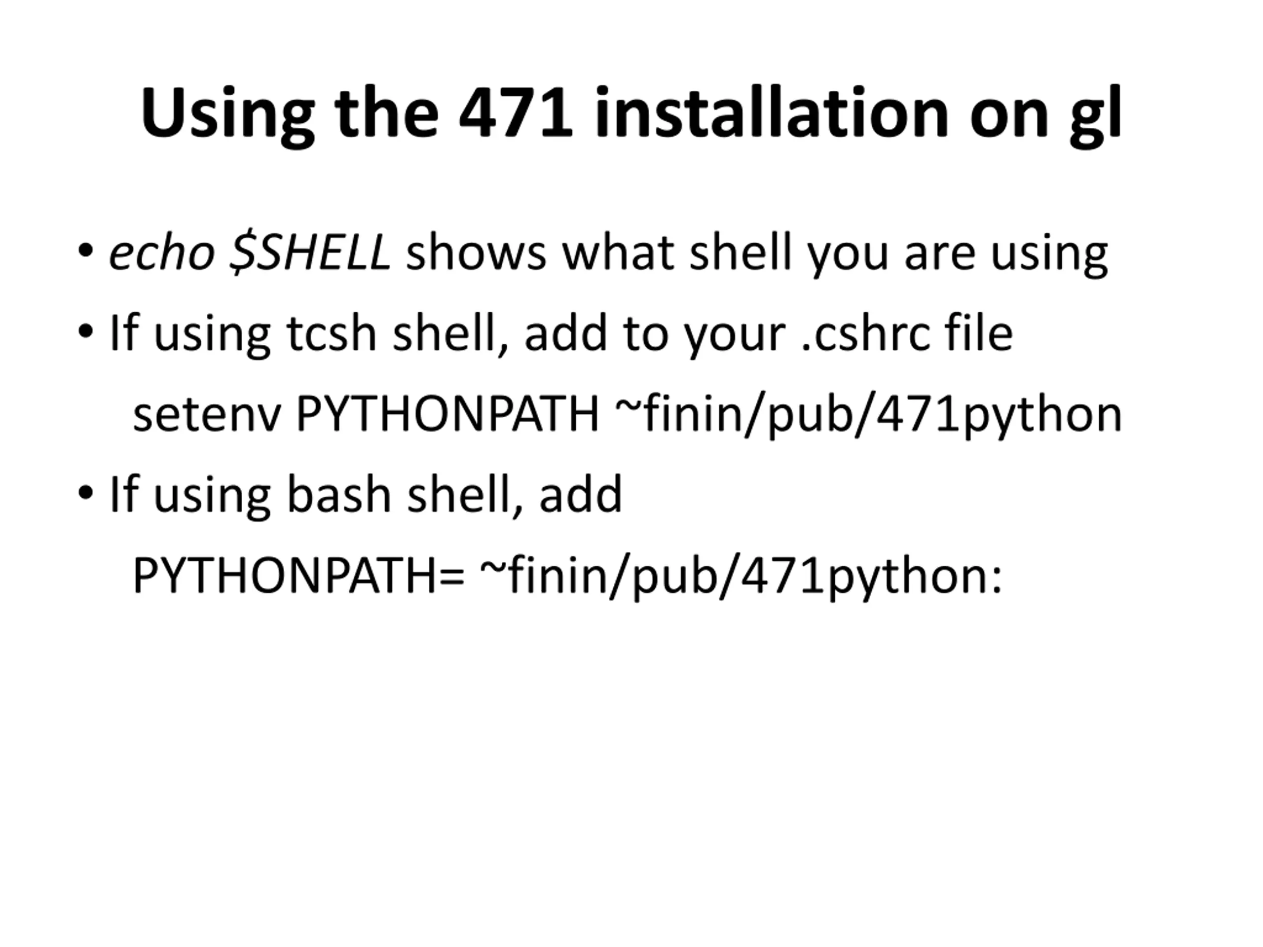 Using the 471 installation on gl echo $SHELL shows what shell you are using If using tcsh shell, add to your .cshrc file setenv PYTHONPATH ~finin/pub/471python If using bash shell, add PYTHONPATH= ~finin/pub/471python: