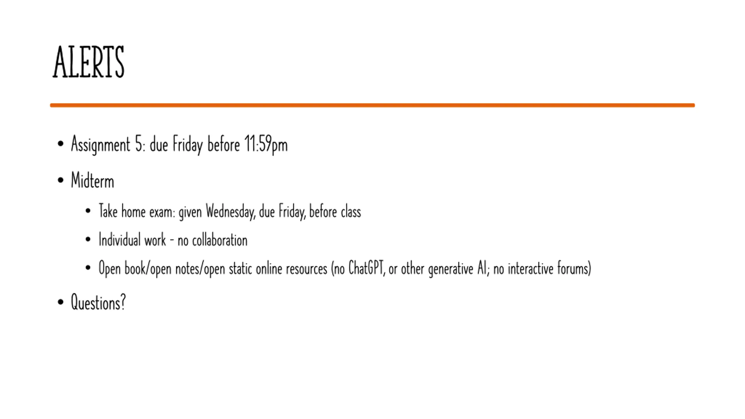 Alerts Assignment 5: due Friday before 11:59pm Midterm Take home exam: given Wednesday, due Friday, before class Individual work no collaboration Open book/open notes/open static online resources (no ChatGPT, or other generative AI; no interactive forums) Questions?