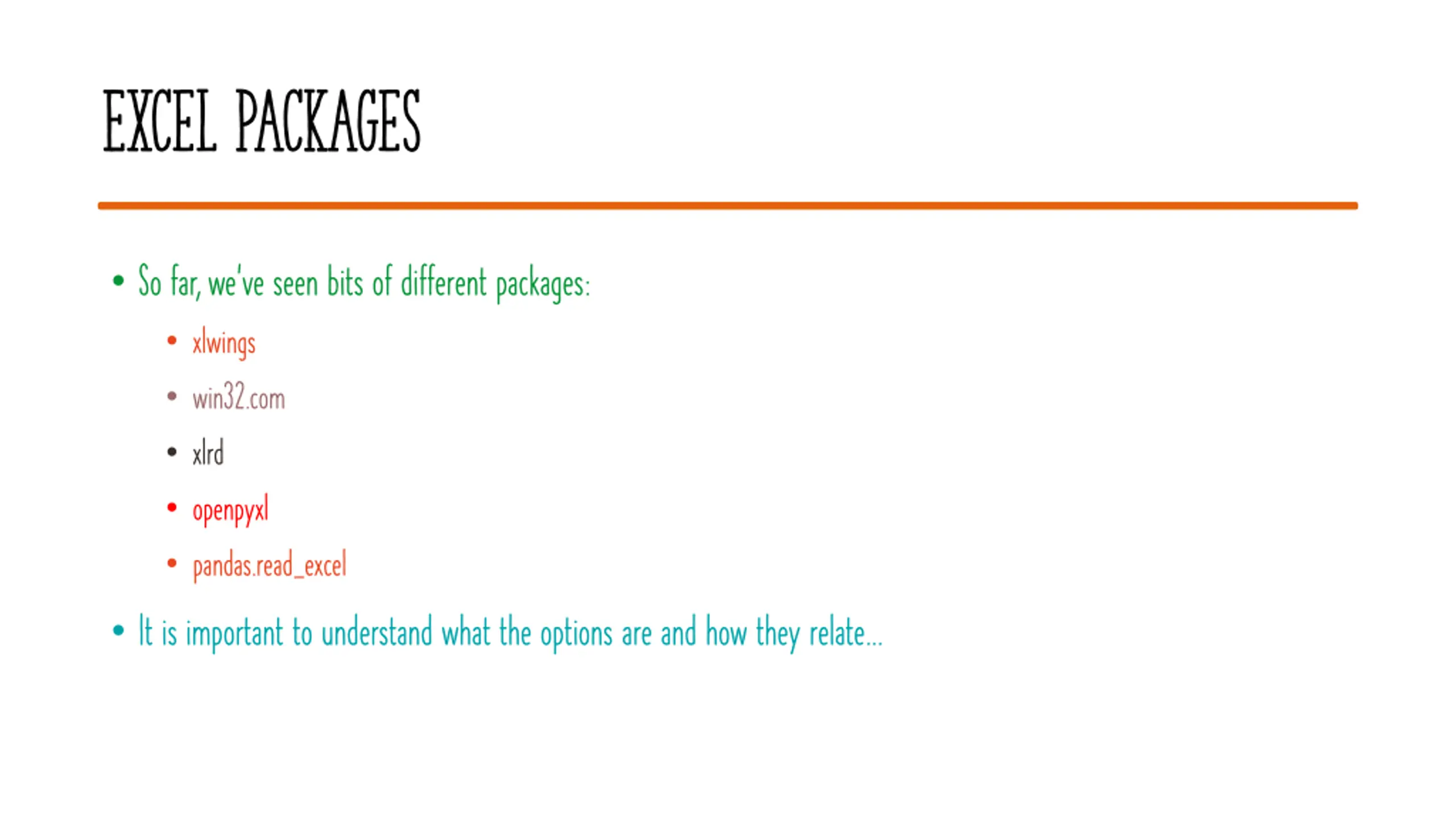 Excel Packages So far, we've seen bits of different packages: xlwings win32.com xlrd openpyxl pandas.read_excel It is important to understand what the options are and how they relate...