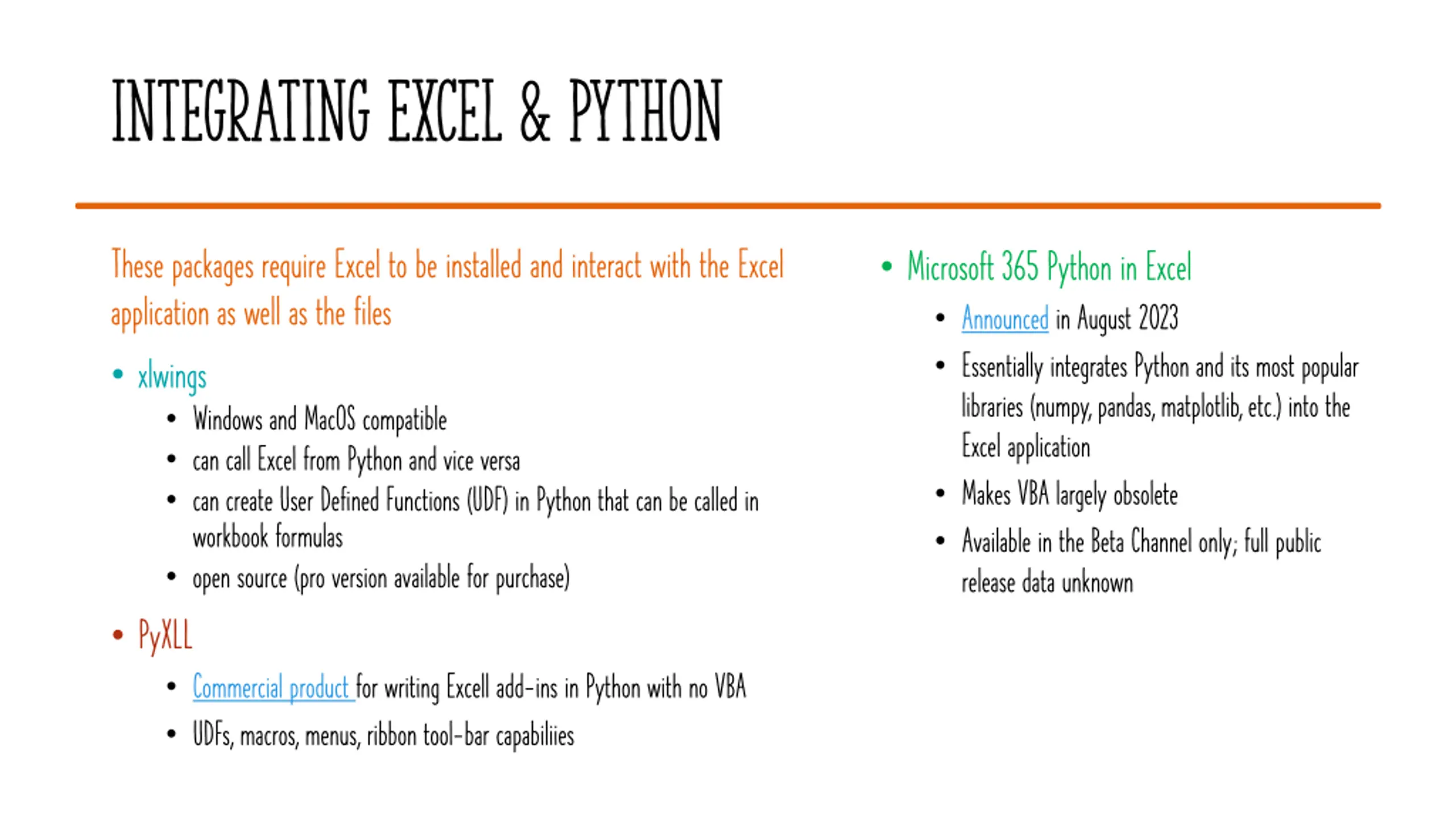Integrating Excel & Python These packages require Excel to be installed and interact with the Excel application as well as the files xlwings Windows and MacOS compatible can call Excel from Python and vice versa can create User Defined Functions (UDF) in Python that can be called in workbook formulas open source (pro version available for purchase) PyXLL Commercial product for writing Excell add-ins in Python with no VBA UDFs, macros, menus, ribbon tool-bar capabiliies Microsoft 365 Python in Excel Announced in August 2023 Essentially integrates Python and its most popular libraries (numpy, pandas, matplotlib, etc.) into the Excel application Makes VBA largely obsolete Available in the Beta Channel only; full public release data unknown