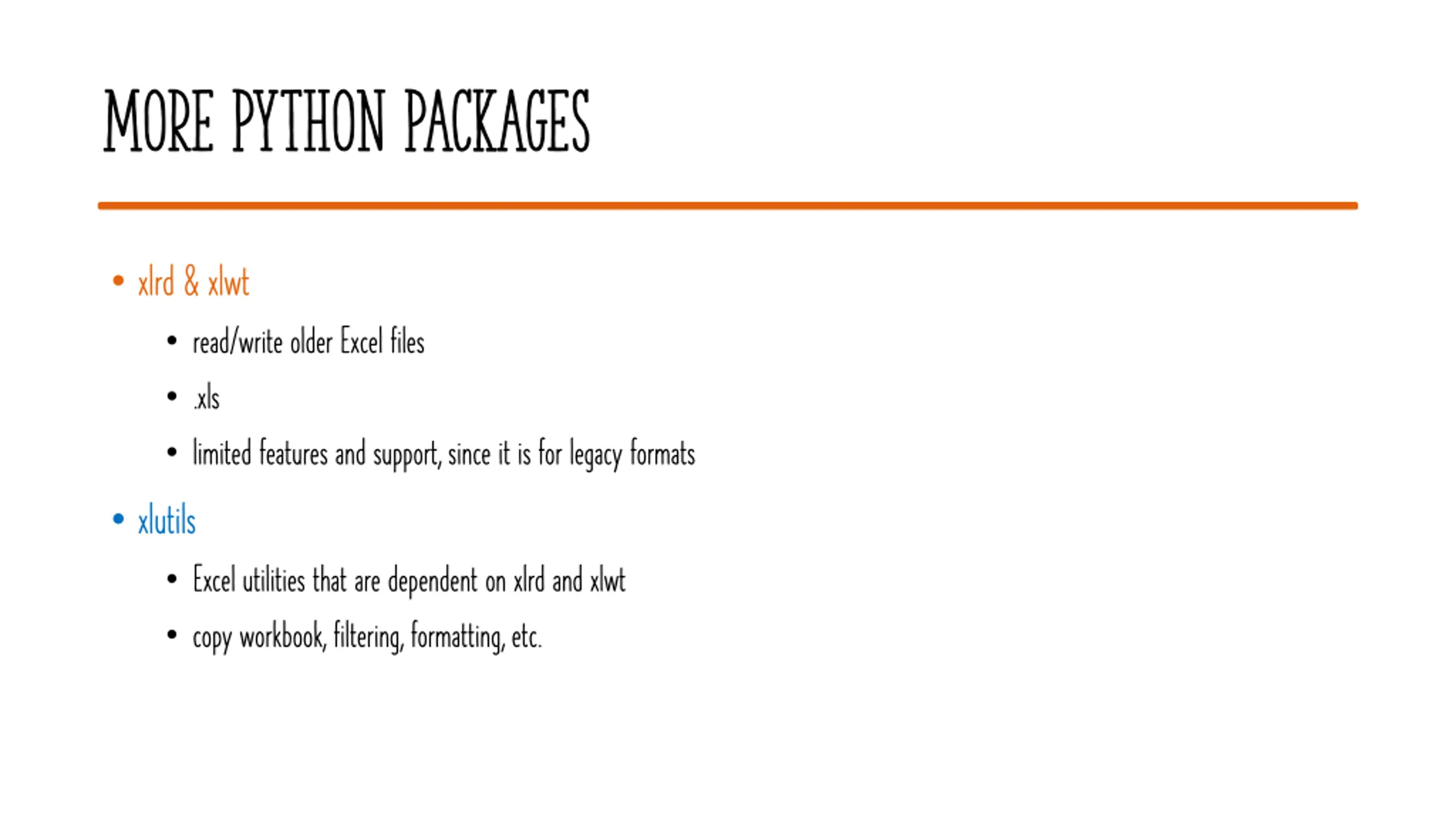 More Python Packages xlrd & xlwt read/write older Excel files .xls limited features and support, since it is for legacy formats xlutils Excel utilities that are dependent on xlrd and xlwt copy workbook, filtering, formatting, etc.