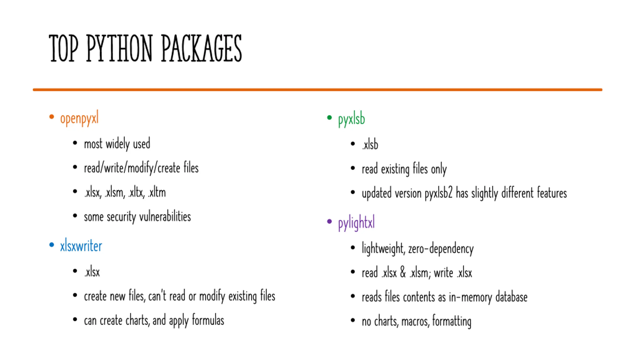 Top Python Packages openpyxl most widely used read/write/modify/create files .xlsx, .xlsm, .xltx, .xltm some security vulnerabilities xlsxwriter .xlsx create new files, can't read or modify existing files can create charts, and apply formulas pyxlsb .xlsb read existing files only updated version pyxlsb2 has slightly different features pylightxl lightweight, zero-dependency read .xlsx & .xlsm; write .xlsx reads files contents as in-memory database no charts, macros, formatting