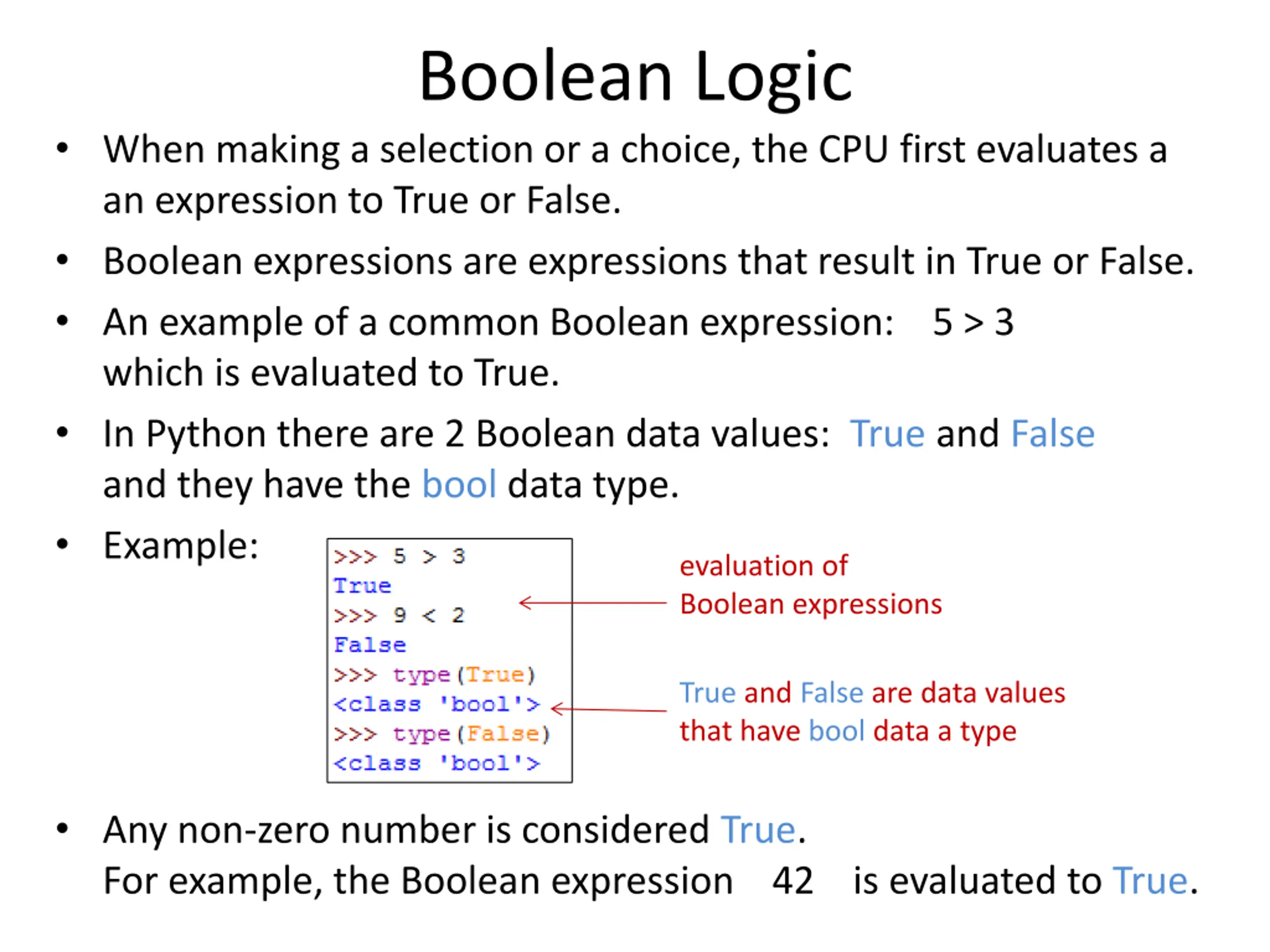 Boolean Logic When making a selection or a choice, the CPU first evaluates a an expression to True or False. Boolean expressions are expressions that result in True or False. An example of a common Boolean expression: 5 > 3 which is evaluated to True. In Python there are 2 Boolean data values: True and False and they have the bool data type. Example: evaluation of Boolean expressions True and False are data values that have bool data a type Any non-zero number is considered True. For example, the Boolean expression 42 is evaluated to True.