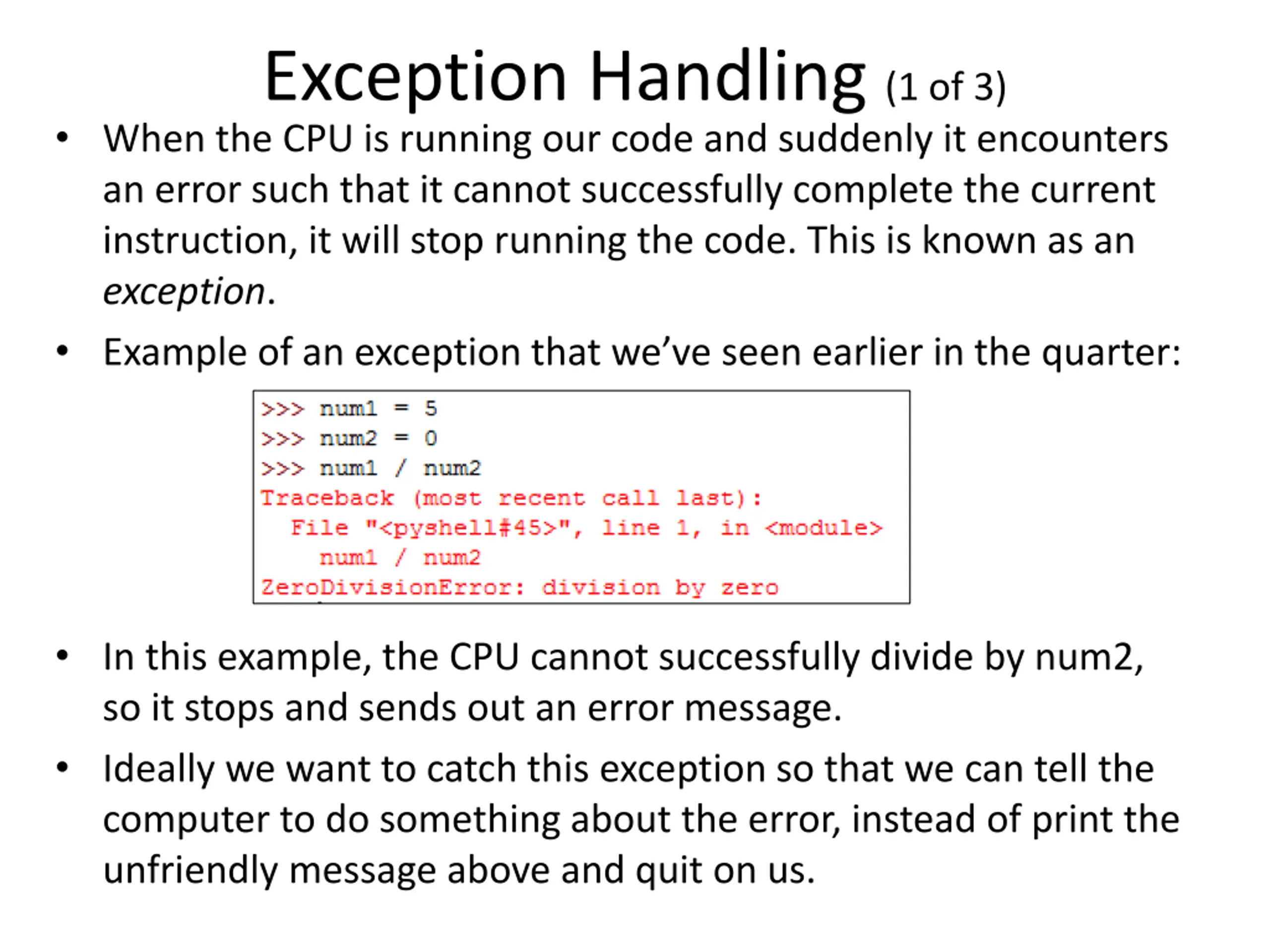Exception Handling (1 of 3) When the CPU is running our code and suddenly it encounters an error such that it cannot successfully complete the current instruction, it will stop running the code. This is known as an exception. Example of an exception that we ve seen earlier in the quarter: In this example, the CPU cannot successfully divide by num2, so it stops and sends out an error message. Ideally we want to catch this exception so that we can tell the computer to do something about the error, instead of print the unfriendly message above and quit on us.