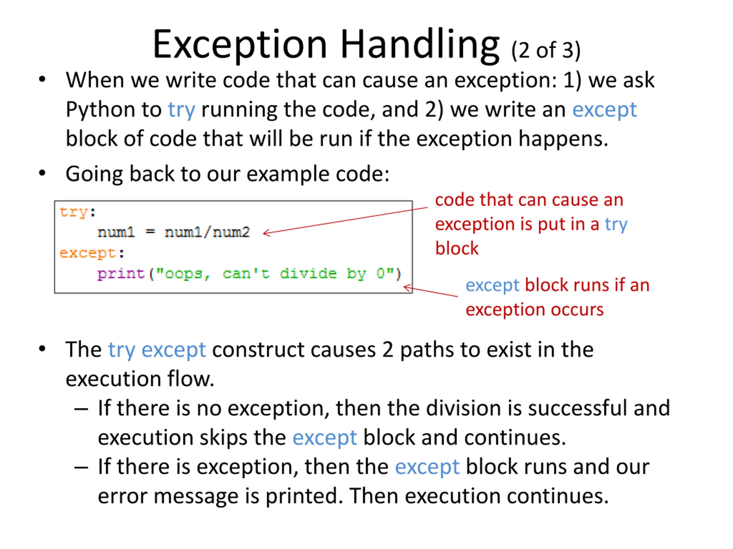 Exception Handling (2 of 3) When we write code that can cause an exception: 1) we ask Python to try running the code, and 2) we write an except block of code that will be run if the exception happens. Going back to our example code: code that can cause an exception is put in a try block except block runs if an exception occurs The try except construct causes 2 paths to exist in the execution flow. If there is no exception, then the division is successful and execution skips the except block and continues. If there is exception, then the except block runs and our error message is printed. Then execution continues.