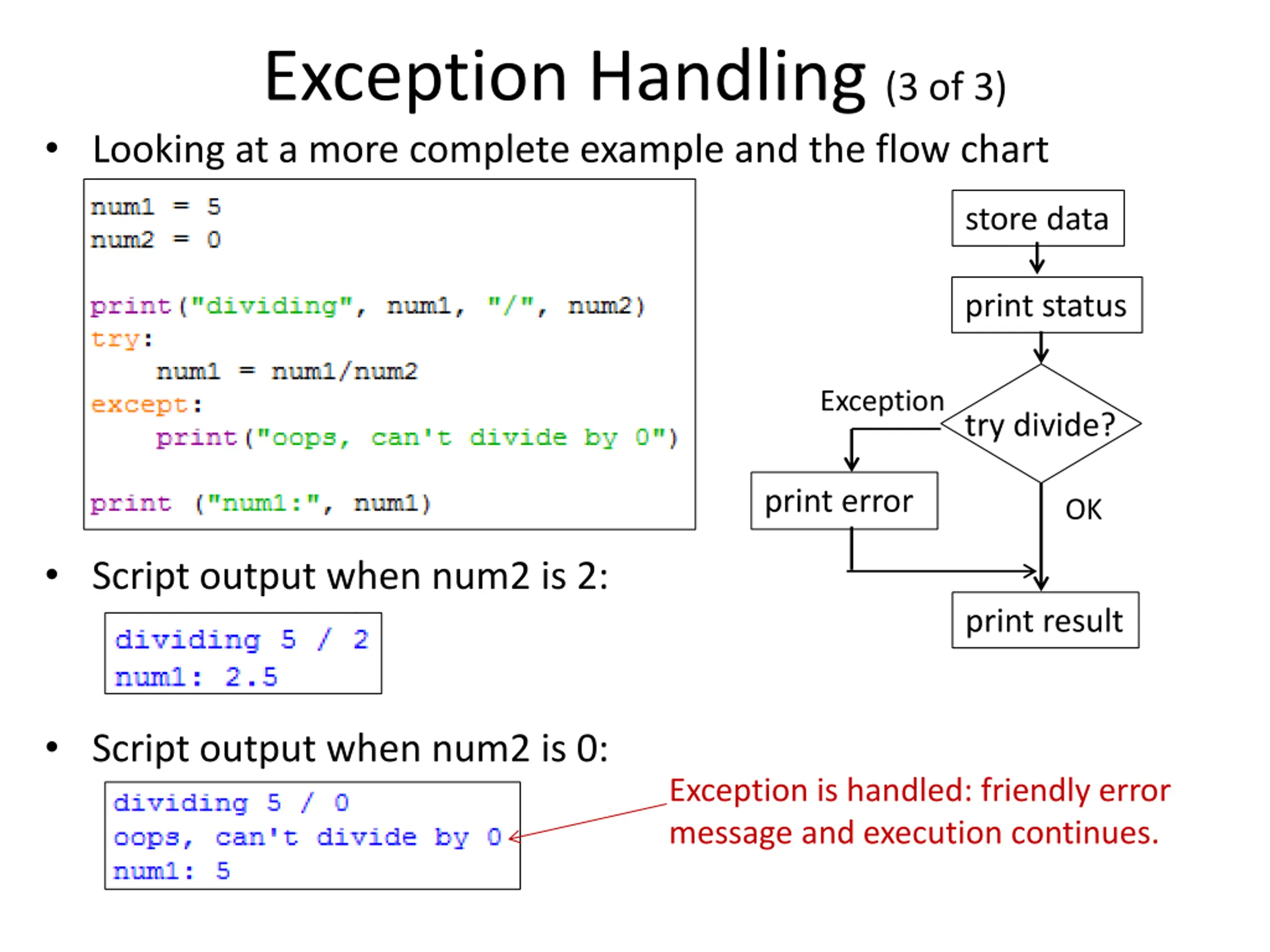 Exception Handling (3 of 3) Looking at a more complete example and the flow chart store data print status Exception try divide? print error OK Script output when num2 is 2: print result Script output when num2 is 0: Exception is handled: friendly error message and execution continues.