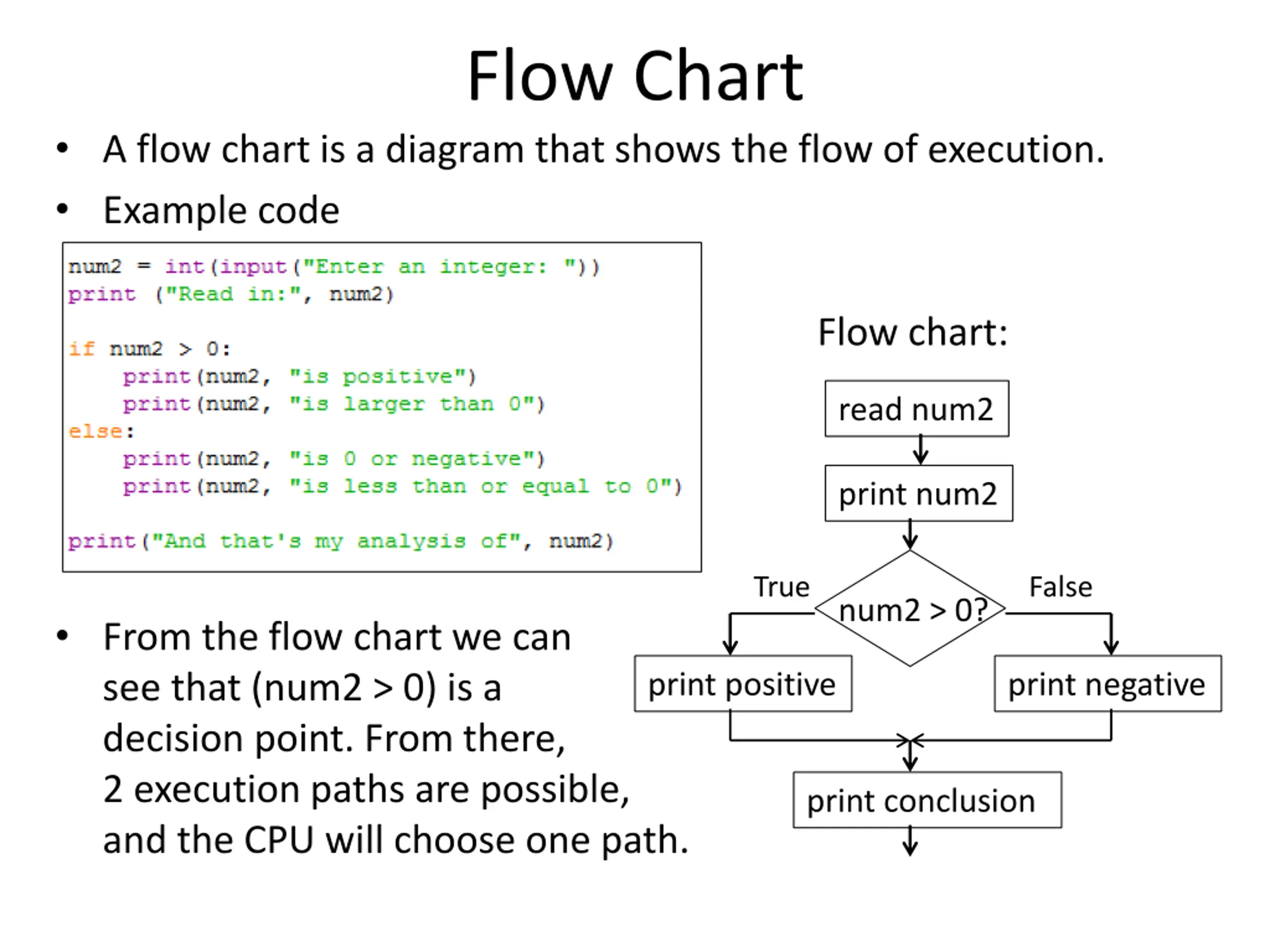 Flow Chart A flow chart is a diagram that shows the flow of execution. Example code Flow chart: read num2 print num2 True False num2 > 0? From the flow chart we can see that (num2 > 0) is a decision point. From there, 2 execution paths are possible, and the CPU will choose one path. print positive print negative print conclusion