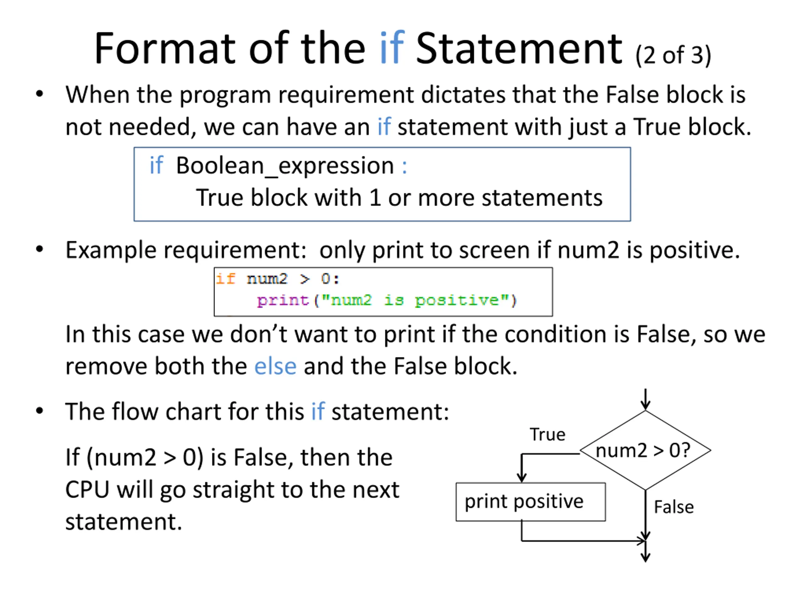 Format of the if Statement (2 of 3) When the program requirement dictates that the False block is not needed, we can have an if statement with just a True block. if Boolean_expression : True block with 1 or more statements Example requirement: only print to screen if num2 is positive. In this case we don t want to print if the condition is False, so we remove both the else and the False block. The flow chart for this if statement: True num2 > 0? If (num2 > 0) is False, then the CPU will go straight to the next statement. print positive False