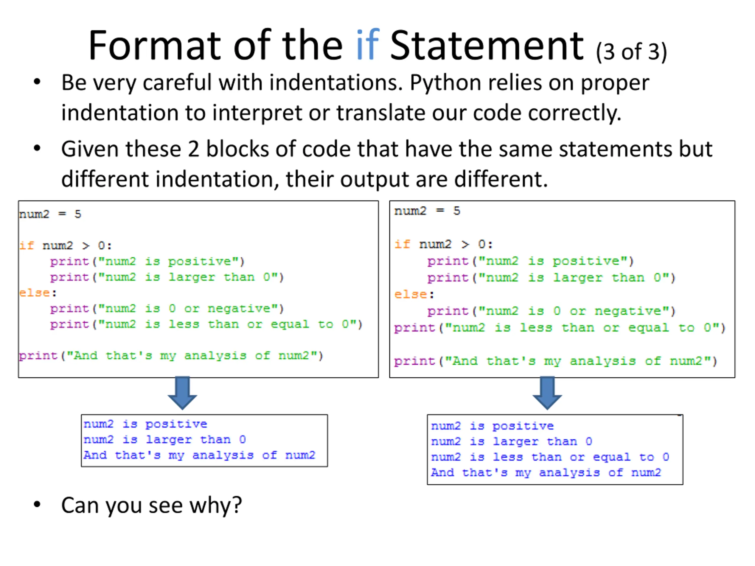Format of the if Statement (3 of 3) Be very careful with indentations. Python relies on proper indentation to interpret or translate our code correctly. Given these 2 blocks of code that have the same statements but different indentation, their output are different. Can you see why?