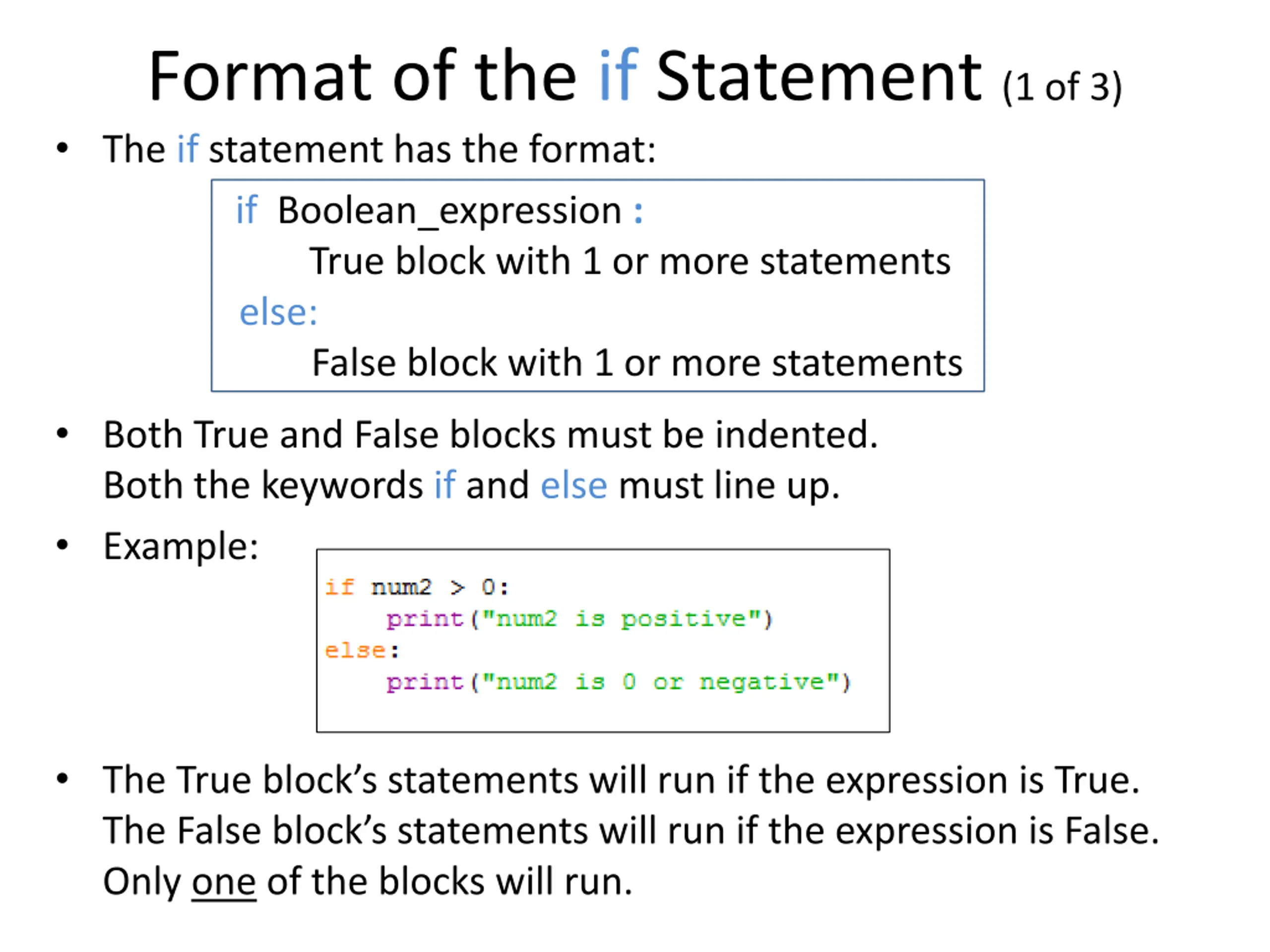 Format of the if Statement (1 of 3) The if statement has the format: if Boolean_expression : True block with 1 or more statements else: False block with 1 or more statements Both True and False blocks must be indented. Both the keywords if and else must line up. Example: The True block s statements will run if the expression is True. The False block s statements will run if the expression is False. Only one of the blocks will run.