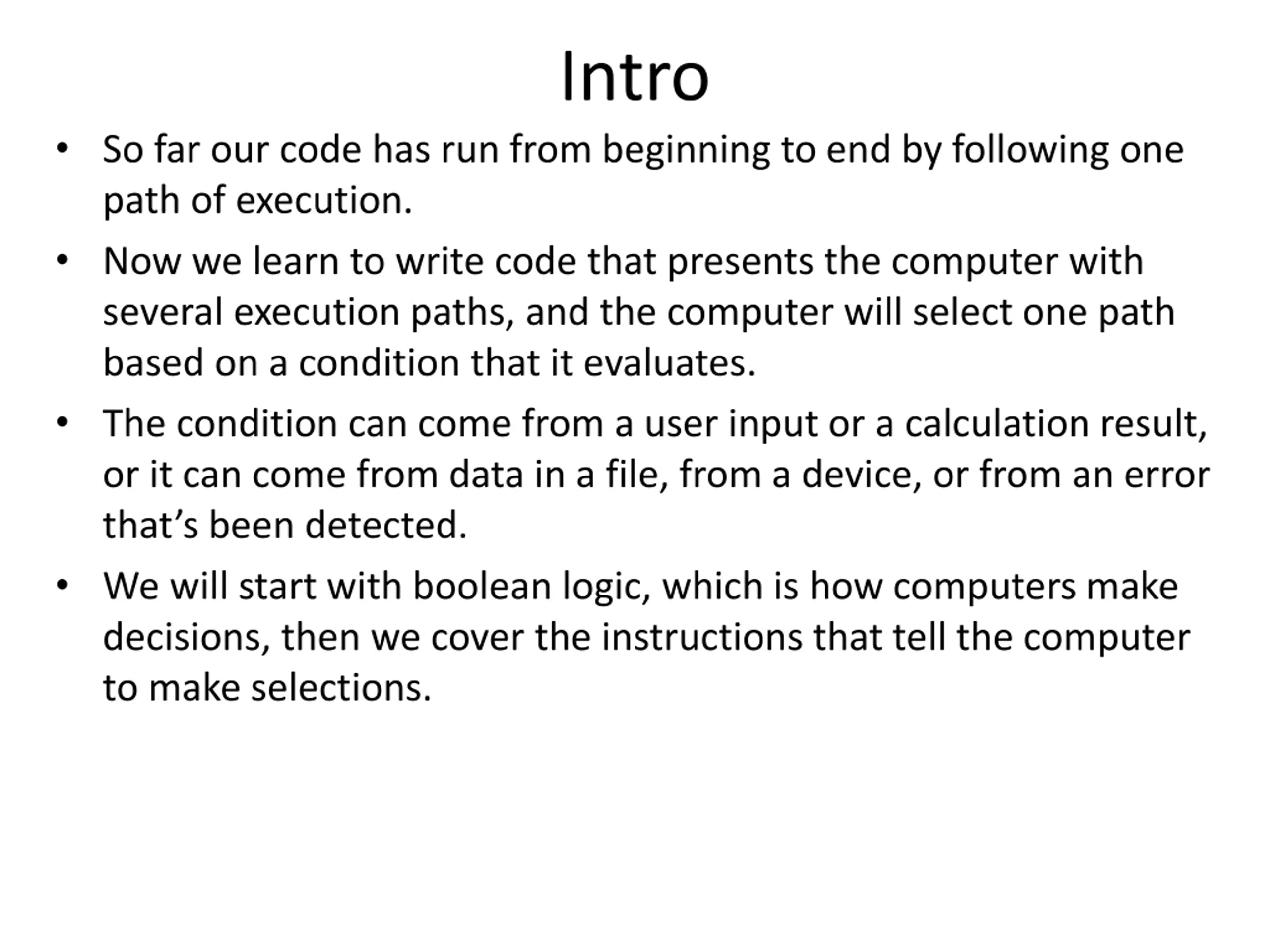 Intro So far our code has run from beginning to end by following one path of execution. Now we learn to write code that presents the computer with several execution paths, and the computer will select one path based on a condition that it evaluates. The condition can come from a user input or a calculation result, or it can come from data in a file, from a device, or from an error that s been detected. We will start with boolean logic, which is how computers make decisions, then we cover the instructions that tell the computer to make selections.