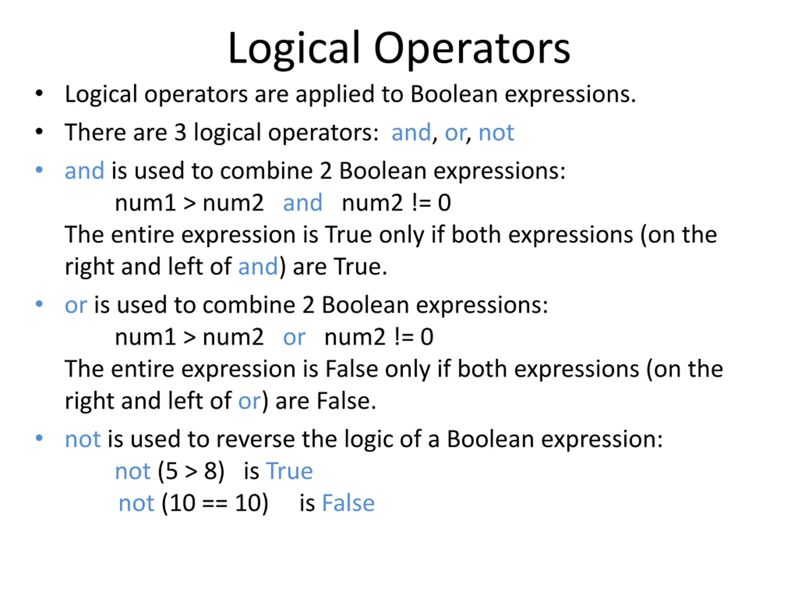 Logical Operators Logical operators are applied to Boolean expressions. There are 3 logical operators: and, or, not and is used to combine 2 Boolean expressions: num1 > num2 and num2 != 0 The entire expression is True only if both expressions (on the right and left of and) are True. or is used to combine 2 Boolean expressions: num1 > num2 or num2 != 0 The entire expression is False only if both expressions (on the right and left of or) are False. not is used to reverse the logic of a Boolean expression: not (5 > 8) is True not (10 == 10) is False