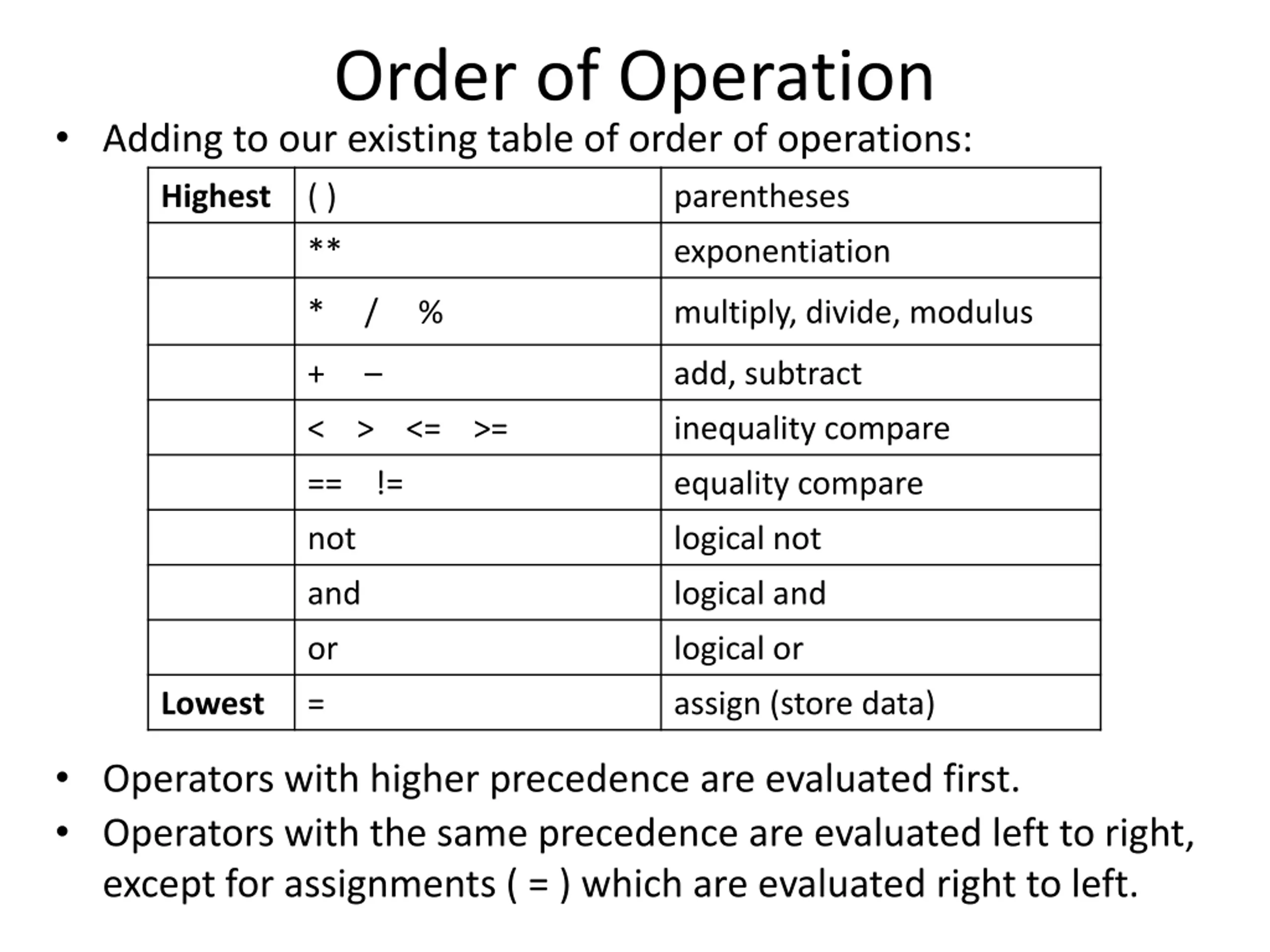 Order of Operation Adding to our existing table of order of operations: Highest ( ) parentheses ** exponentiation * / % multiply, divide, modulus + add, subtract < > <= >= inequality compare == != equality compare not logical not and logical and or logical or Lowest = assign (store data) Operators with higher precedence are evaluated first. Operators with the same precedence are evaluated left to right, except for assignments ( = ) which are evaluated right to left.
