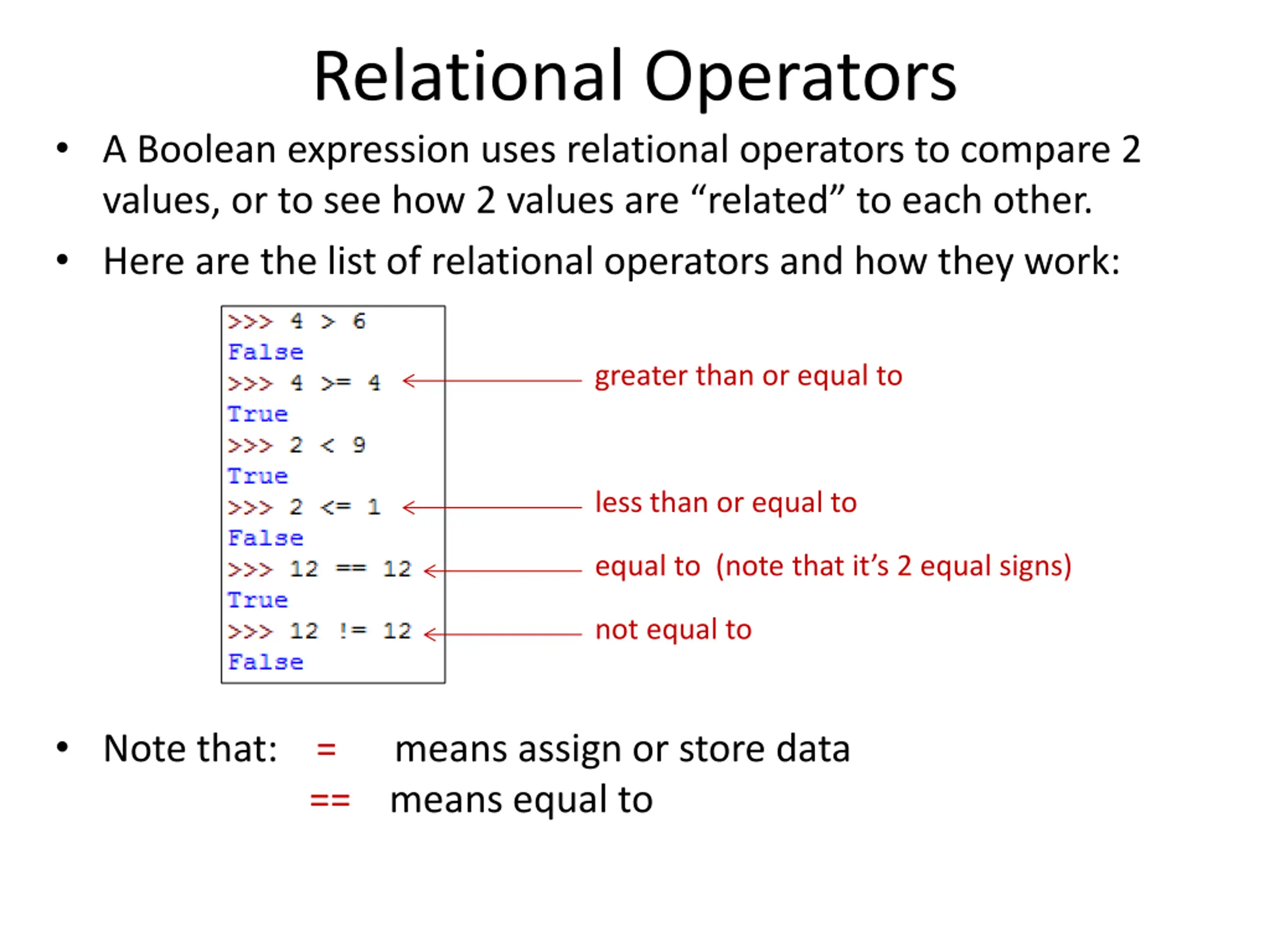 Relational Operators A Boolean expression uses relational operators to compare 2 values, or to see how 2 values are related to each other. Here are the list of relational operators and how they work: greater than or equal to less than or equal to equal to (note that it s 2 equal signs) not equal to Note that: = means assign or store data == means equal to