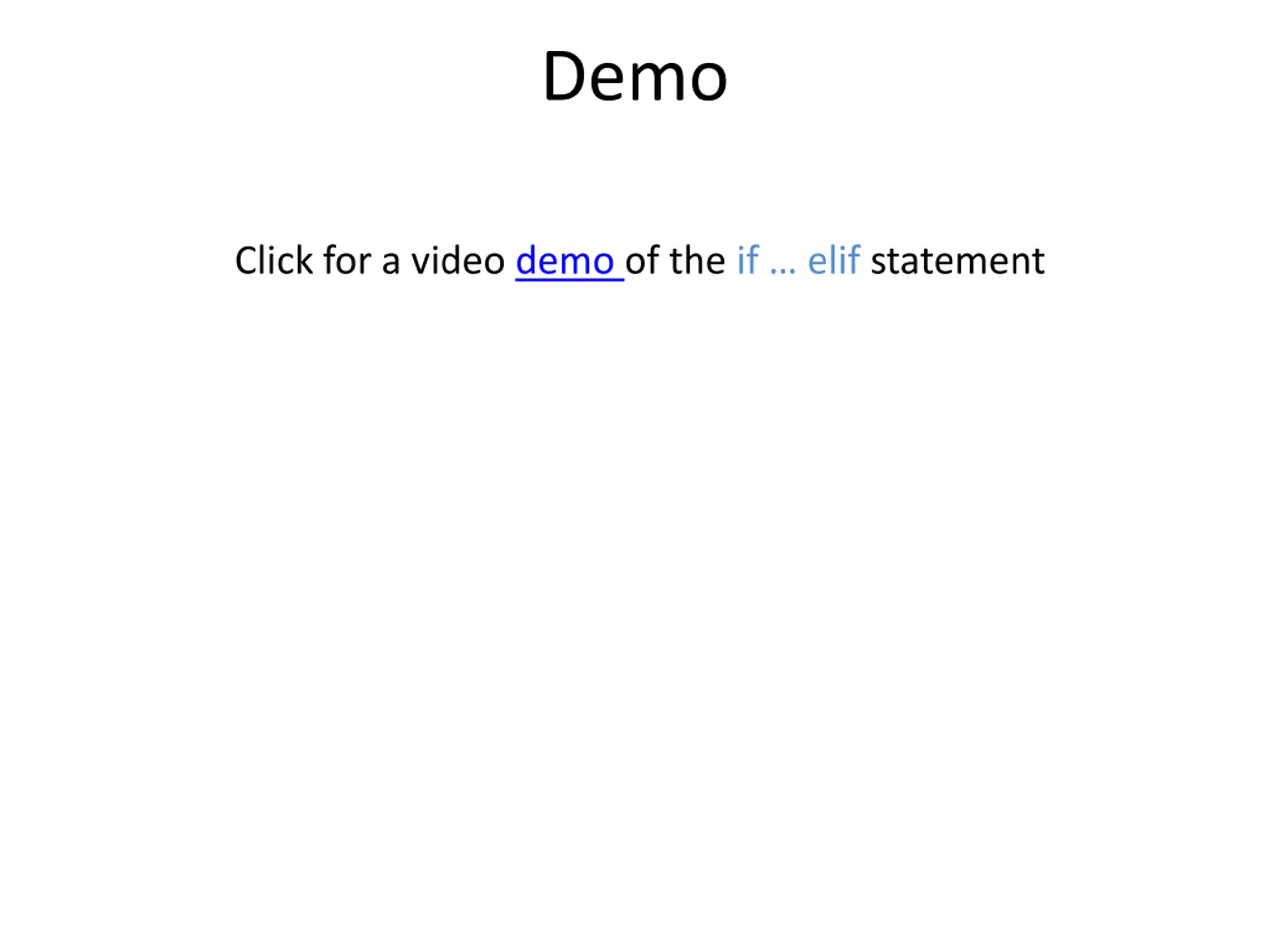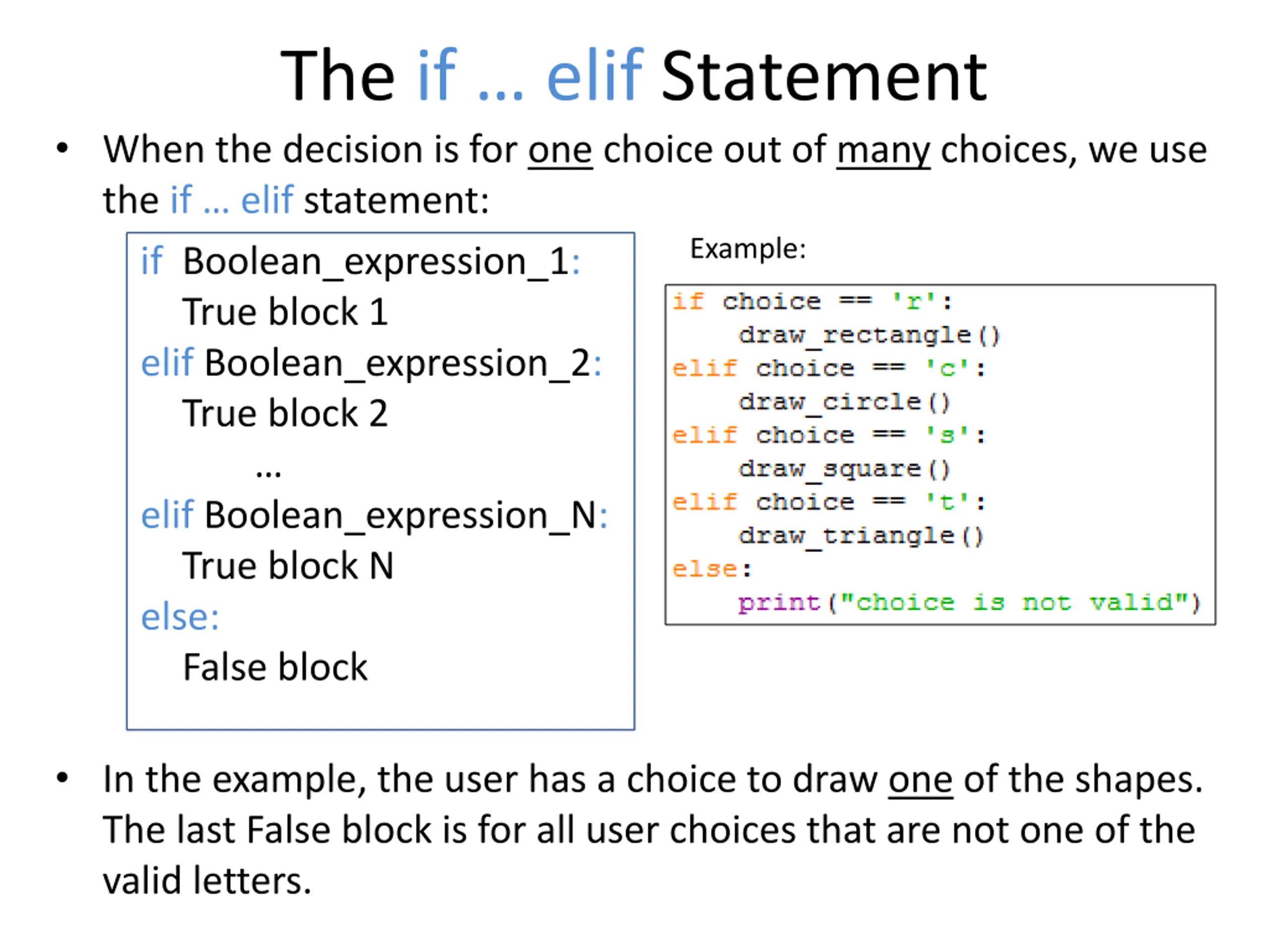 The if elif Statement When the decision is for one choice out of many choices, we use the if elif statement: if Boolean_expression_1: True block 1 elif Boolean_expression_2: True block 2 elif Boolean_expression_N: True block N else: False block Example: In the example, the user has a choice to draw one of the shapes. The last False block is for all user choices that are not one of the valid letters.